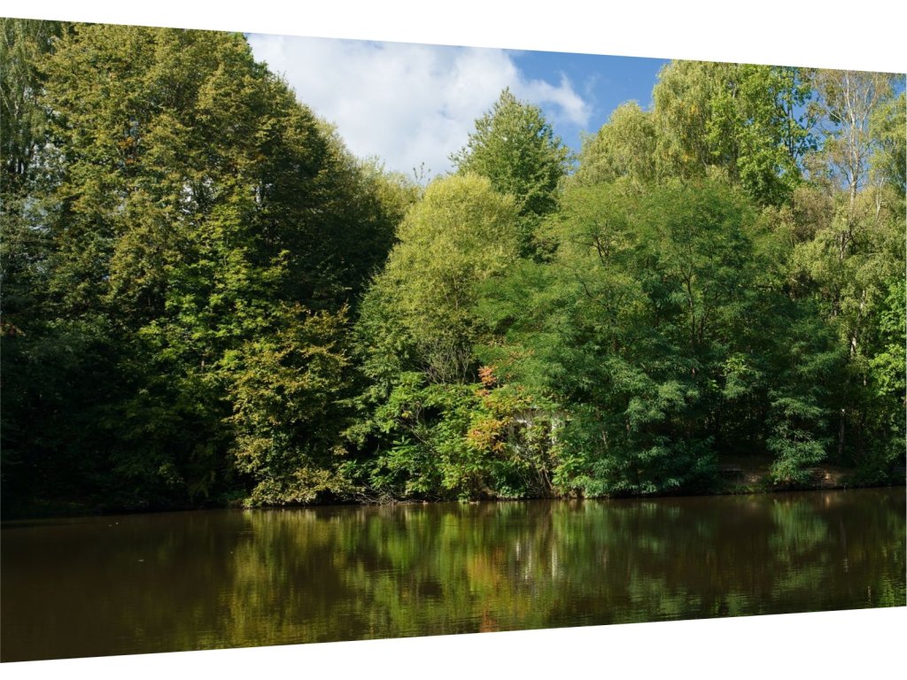 Fotoobraz s motivem jezerní krajiny, kde se stromy odrážejí na klidné hladině vody. Do interiéru vnese harmonii a přírodní klid.