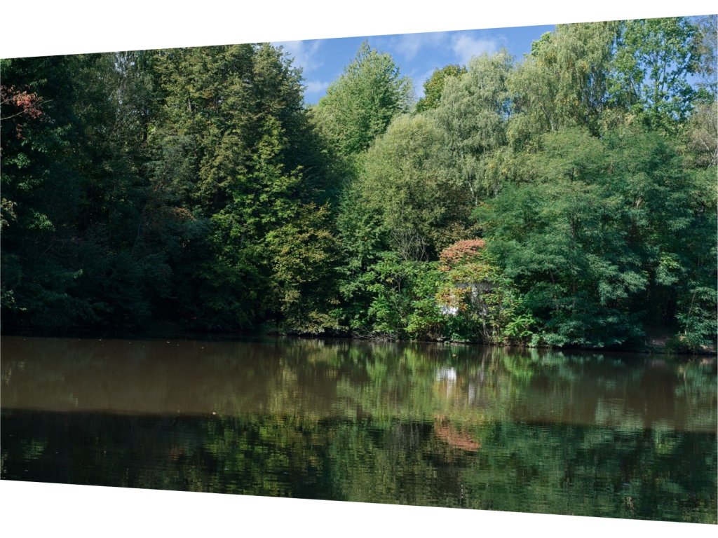 Fotoobraz s motivem jezerní hladiny, která zrcadlí zelené stromy a podzimní tóny. Přinese do interiéru klid a hloubku přírody.