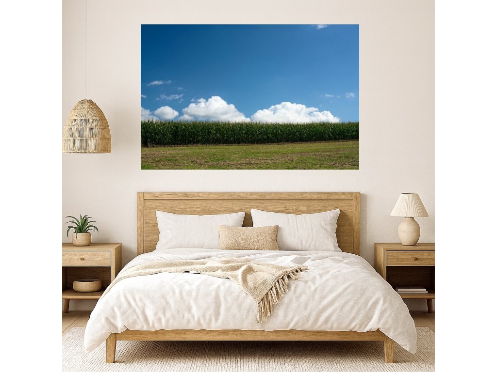 Tento fotoobraz zachycuje kukuřičné pole v plné síle pod modrou oblohou s bílými oblaky. Jednoduchá a čistá kompozice rozdělená do horizontálních vrstev působí uklidňujícím dojmem a přináší do prostoru atmosféru otevřené krajiny.