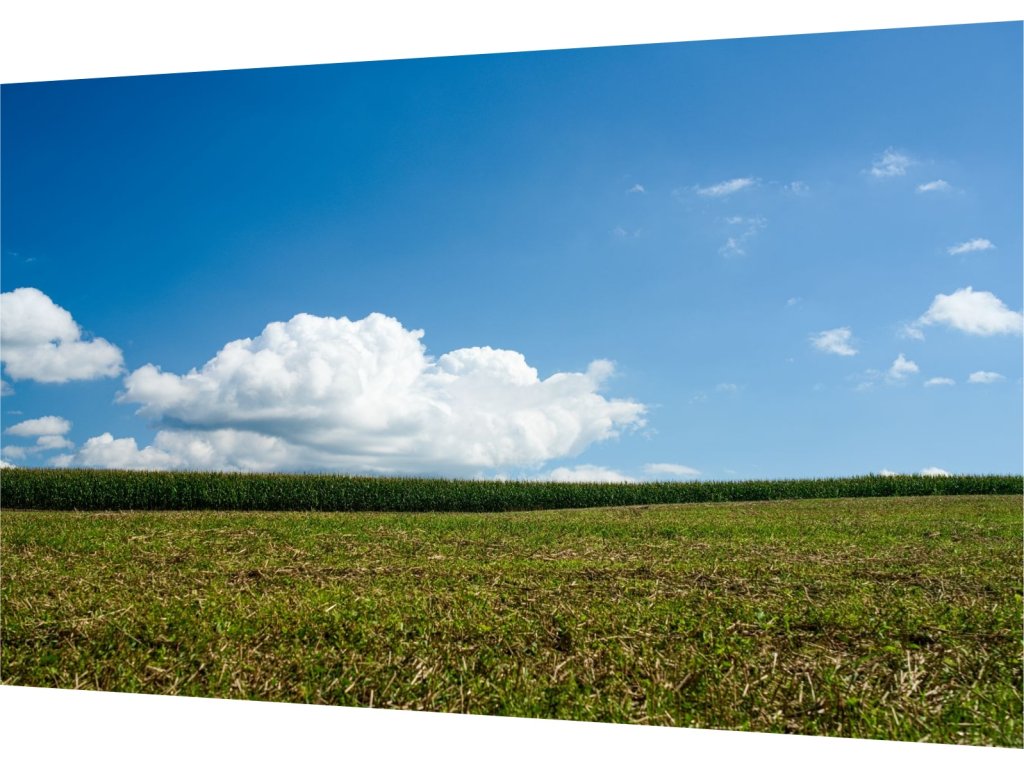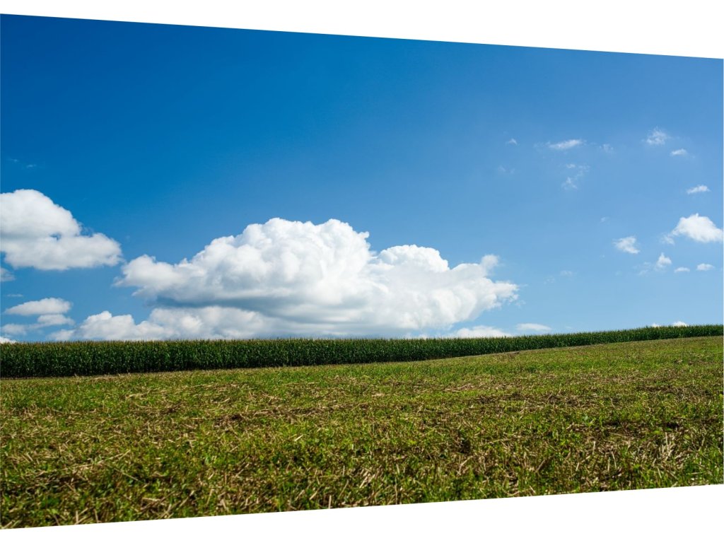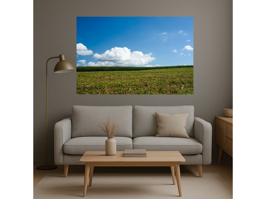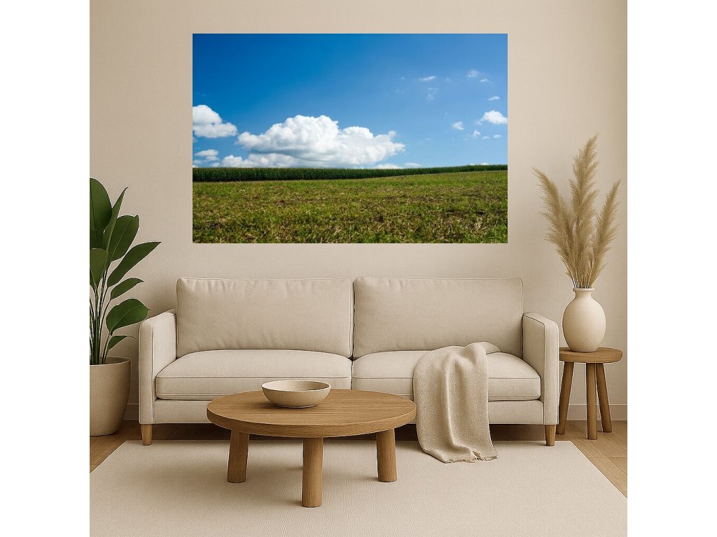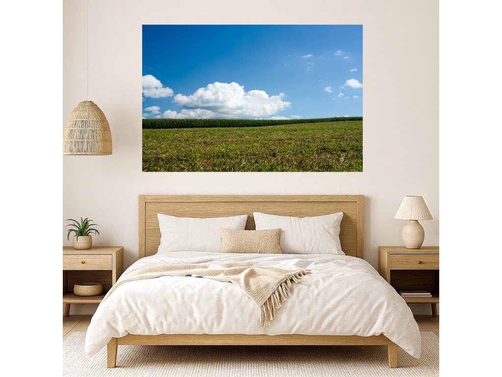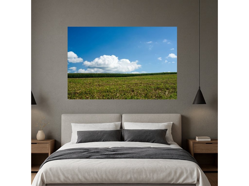Tento fotoobraz vychází z principů minimalistické fotografie. Horizontální vrstvy – tráva, kukuřičné pole a modrá obloha s jediným dominantním oblakem – vytvářejí harmonickou kompozici, která vynikne zejména ve větším formátu.