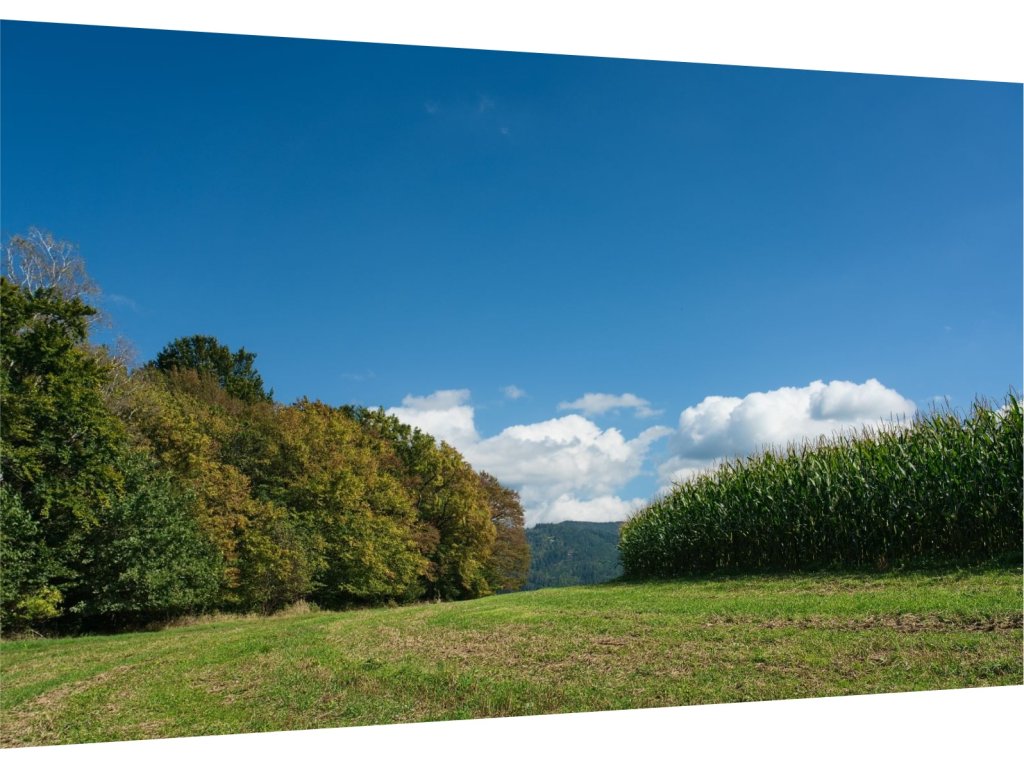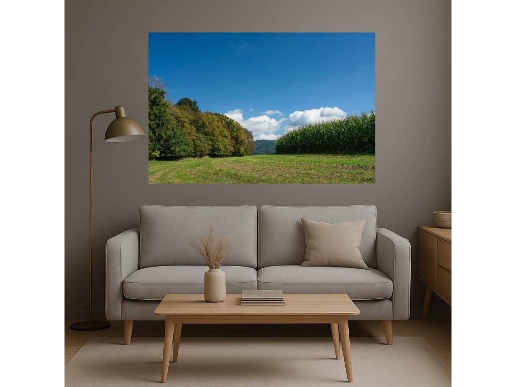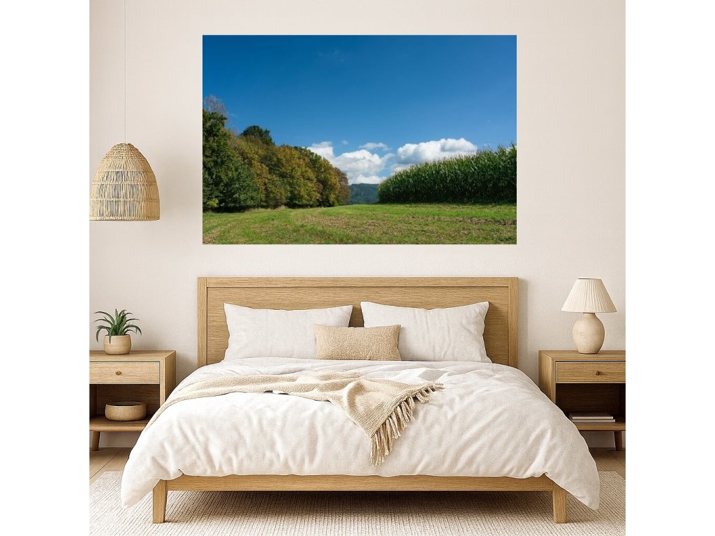 Tento fotoobraz zachycuje typickou podzimní krajinu – zelené kukuřičné pole přechází v pestré stromy s barevným listím a v pozadí se rýsují horské vrcholy. Jasná modrá obloha s bílými oblaky dodává celé scenérii hloubku a vzdušnost.
