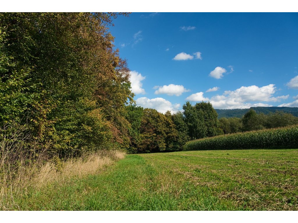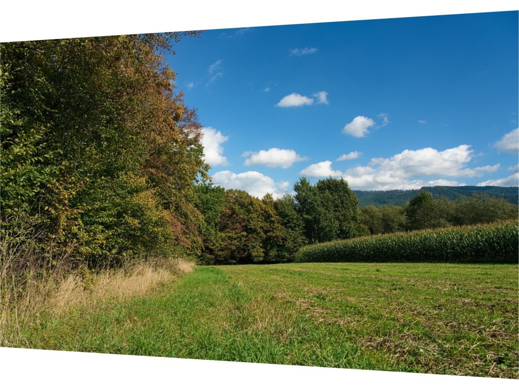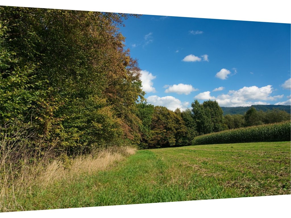 Tento fotoobraz zachycuje okraj podzimního lesa se zbarveným listím, které kontrastuje se zeleným kukuřičným polem a travnatou loukou. V pozadí se rýsují hory a nad nimi modrá obloha s bílými oblaky.