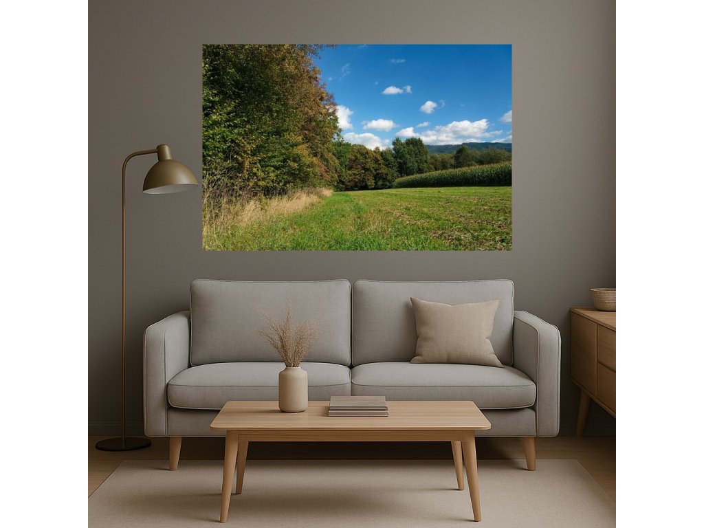 Fotoobraz s motivem podzimního lesa a kukuřičného pole. Teplé barvy přírody vnese do interiéru klid a harmonii.