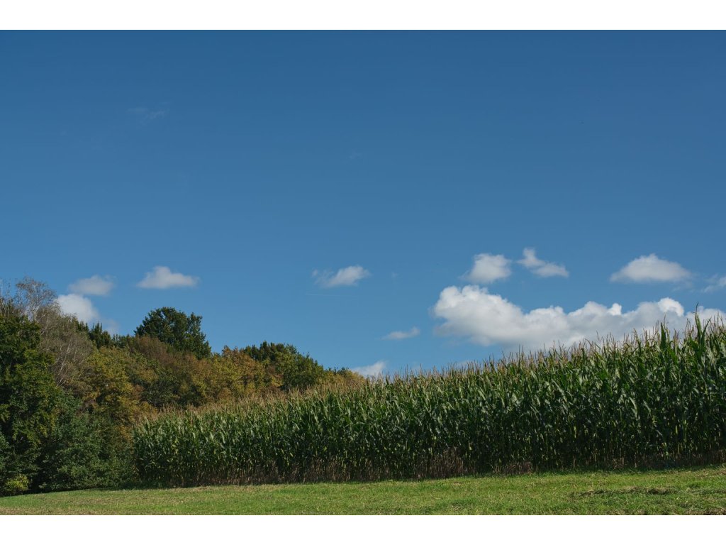 Tento fotoobraz zachycuje kukuřičné pole v podzimním období, za kterým se zvedají zelené koruny stromů. Modrá obloha s několika oblaky dodává celé scéně pocit volného prostoru a klidu.