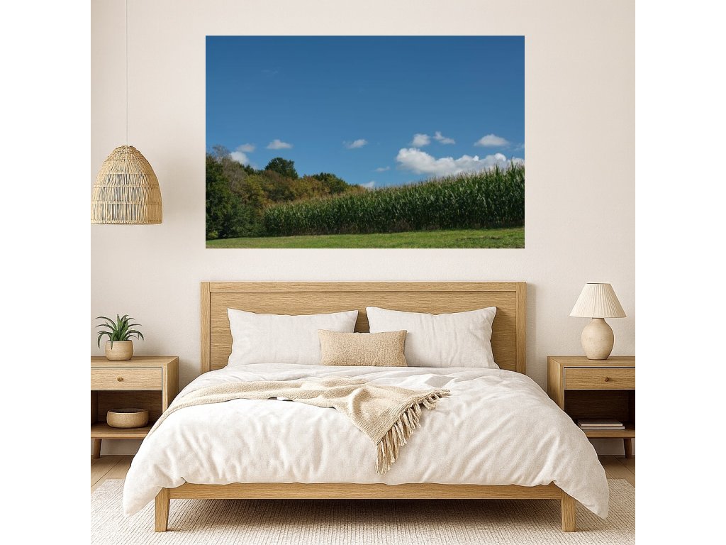 Fotoobraz s motivem podzimního kukuřičného pole a jasné oblohy. Jednoduchý a čistý pohled vnese do interiéru klid a svěžest.