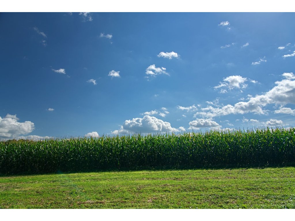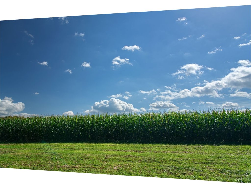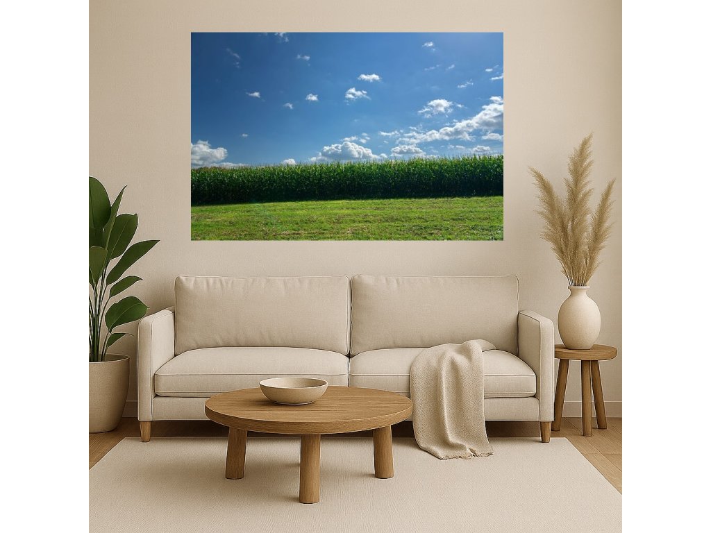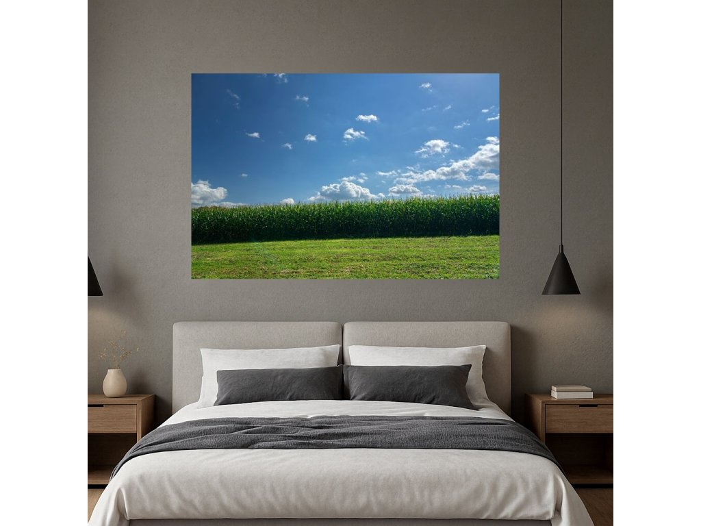 Fotoobraz s motivem kukuřičného pole pod jasnou modrou oblohou s oblaky. Vnese do interiéru svěžest a prostor.