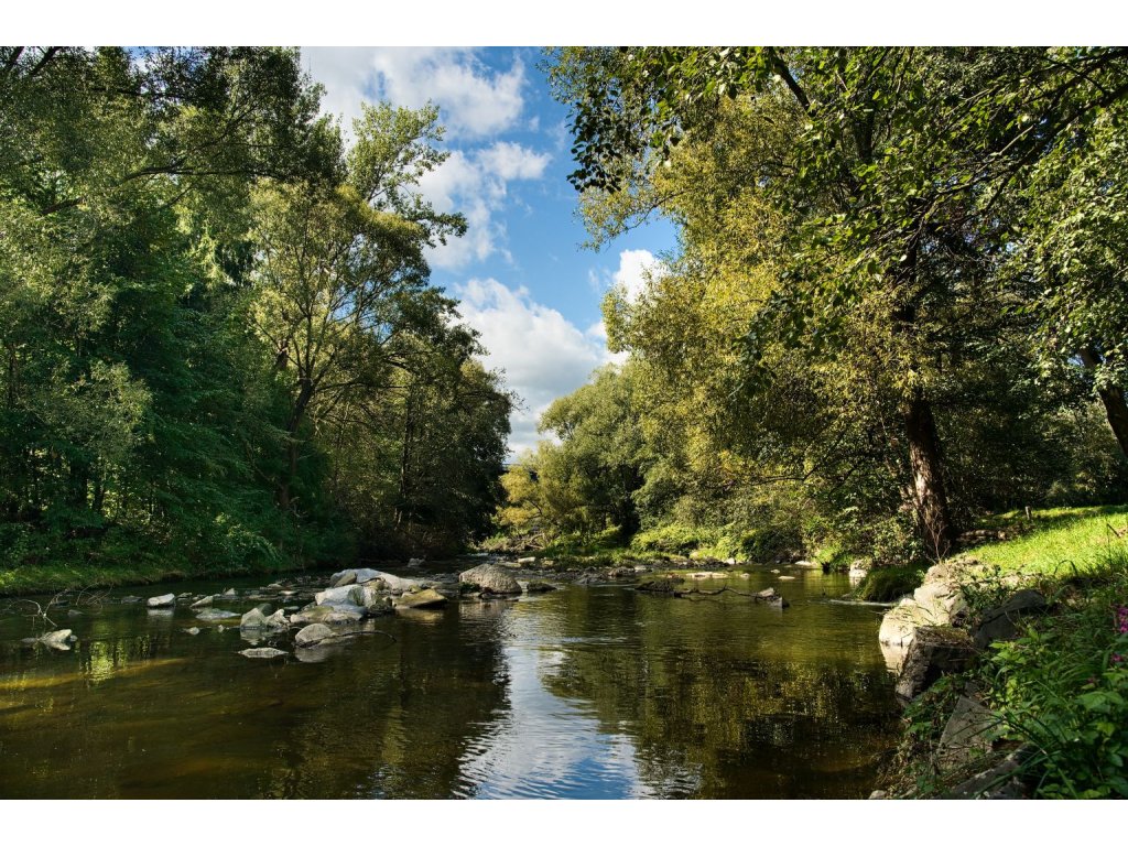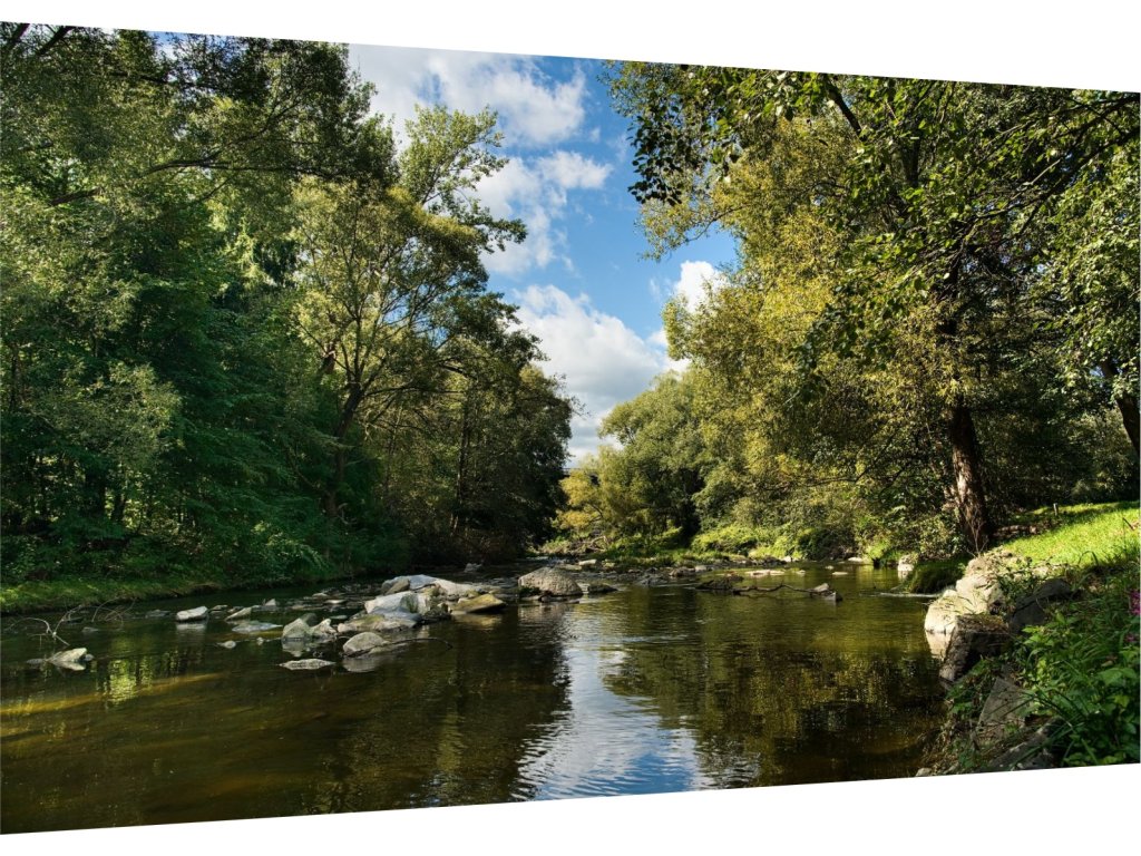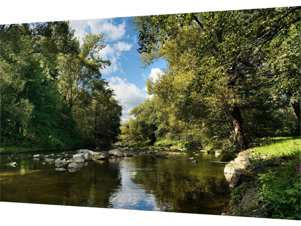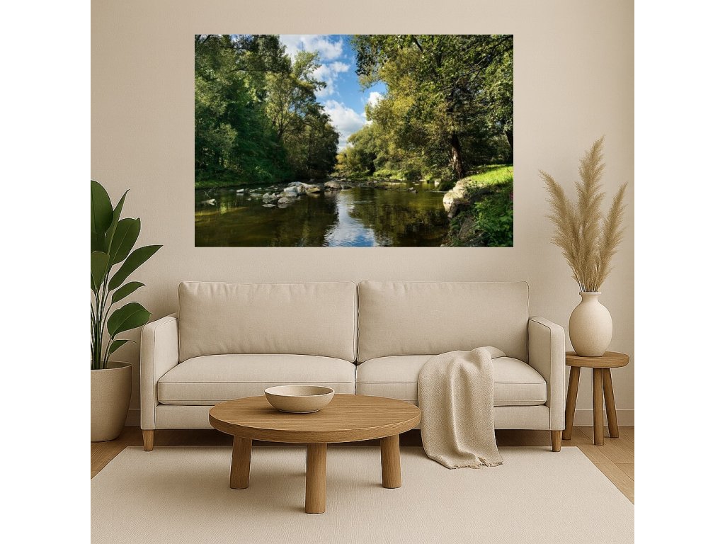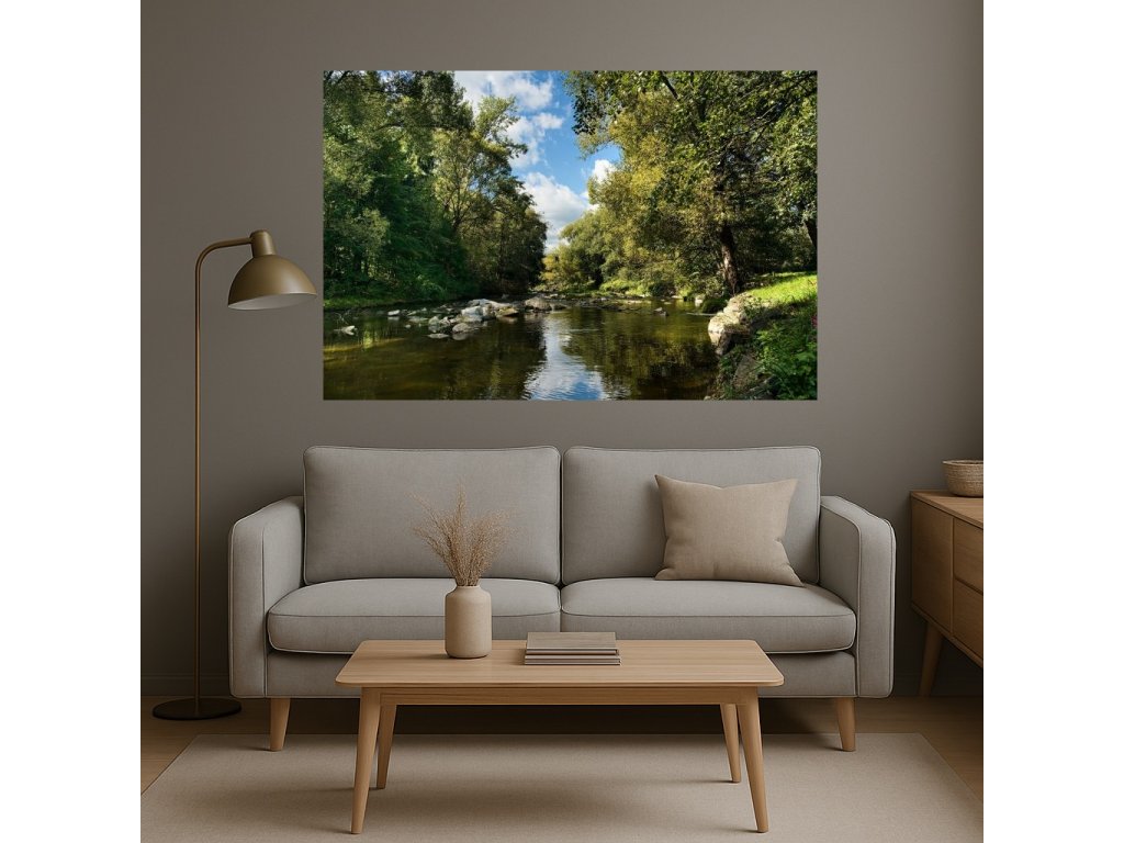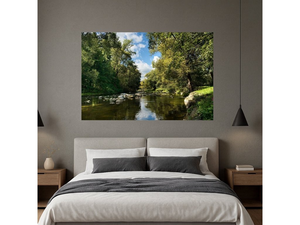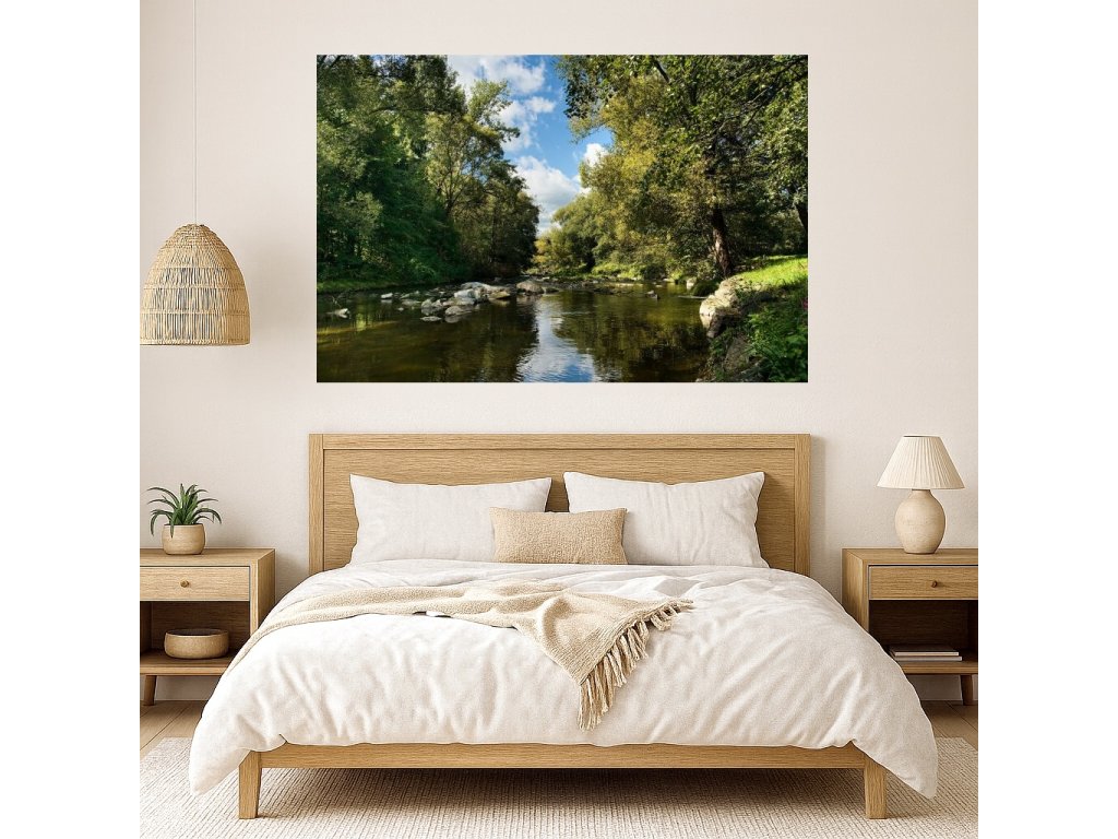 Fotoobraz s motivem klidné řeky lemované stromy a balvany. Světlo na hladině vody vnese do interiéru harmonii a svěžest.