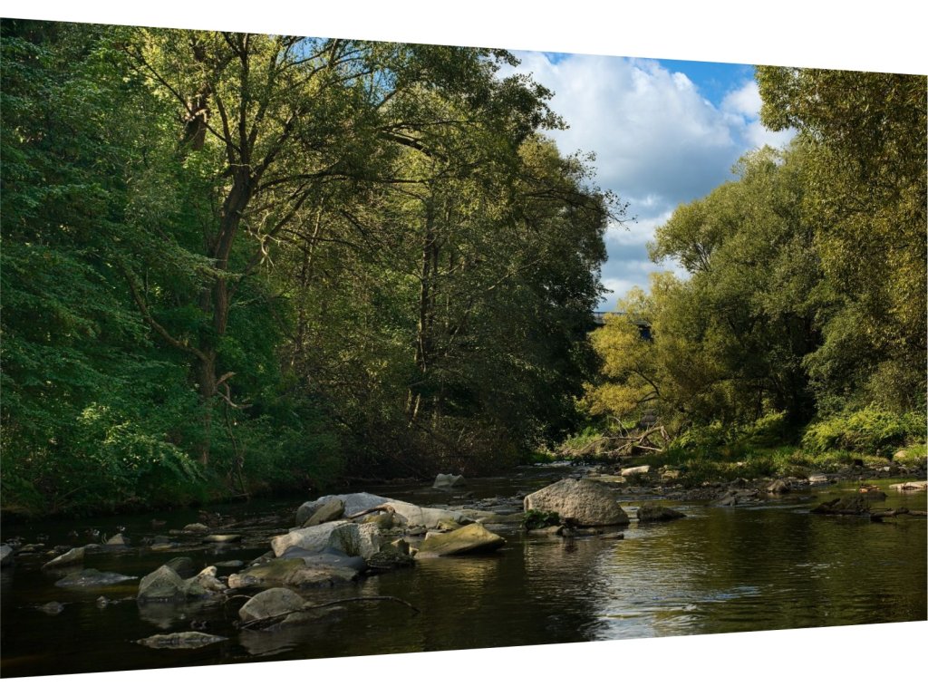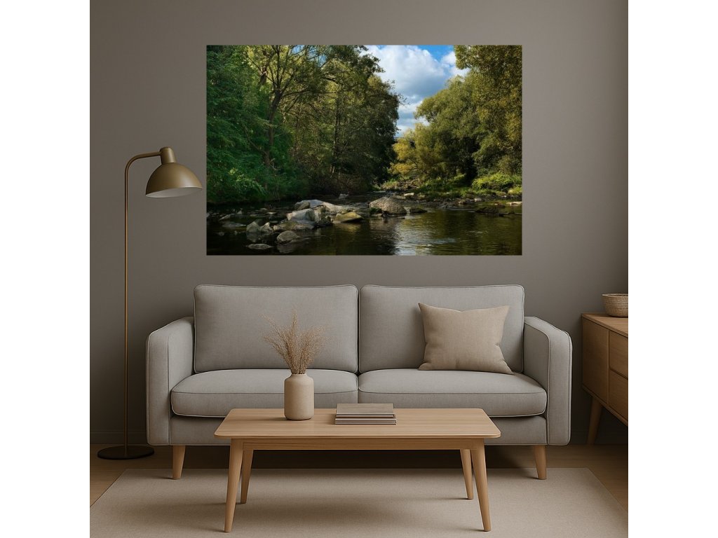 Fotoobraz s motivem říční krajiny, kde voda proudí mezi kameny a stromy. Do interiéru vnese klid i živou energii přírody.