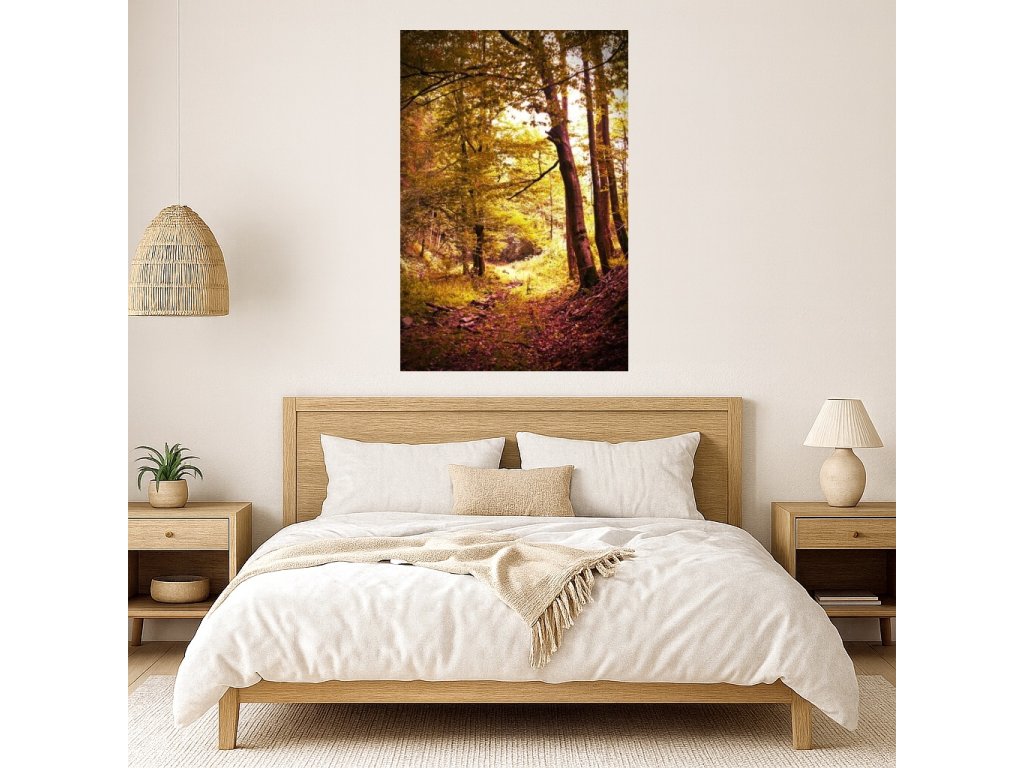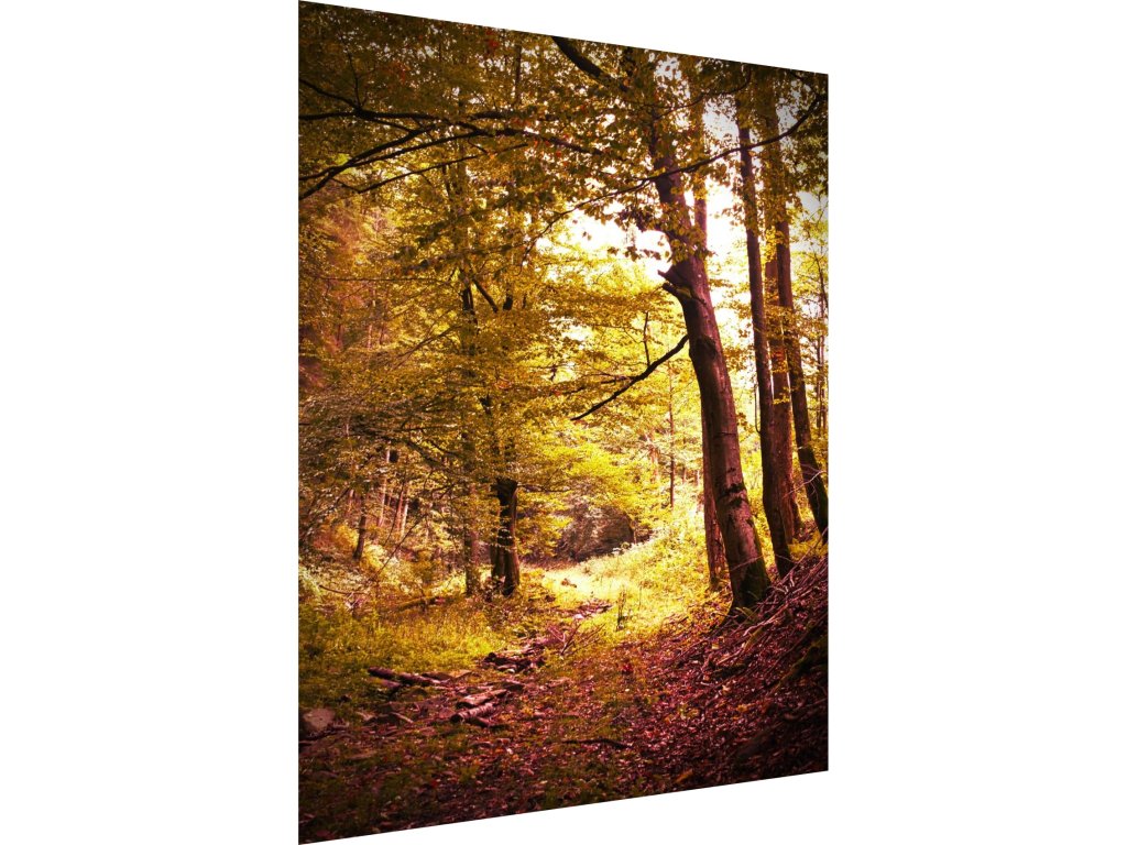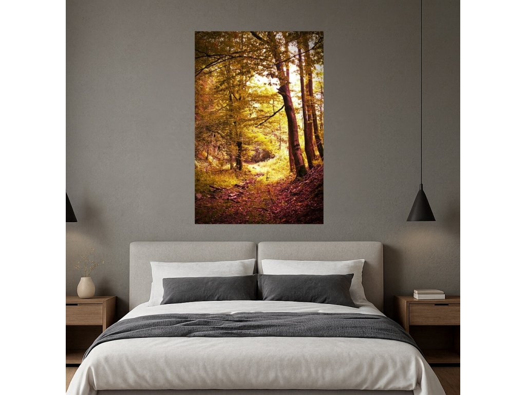 Fotoobraz s motivem podzimního lesa zalitého zlatavým světlem. Vnese do interiéru hřejivou atmosféru a klid.