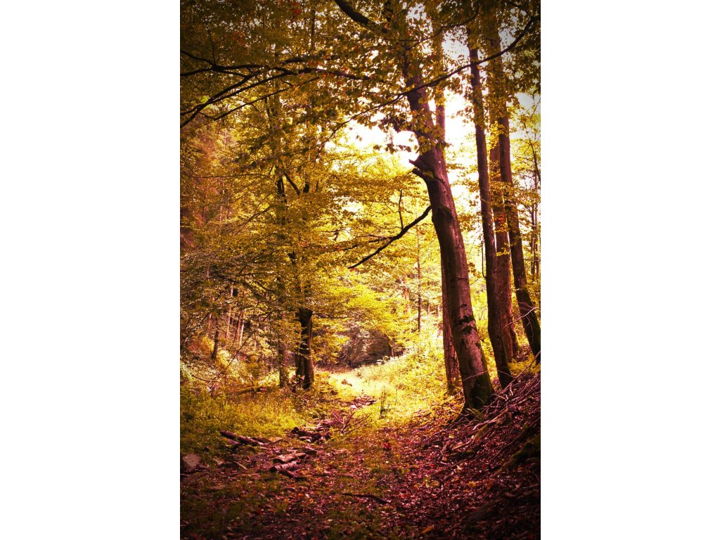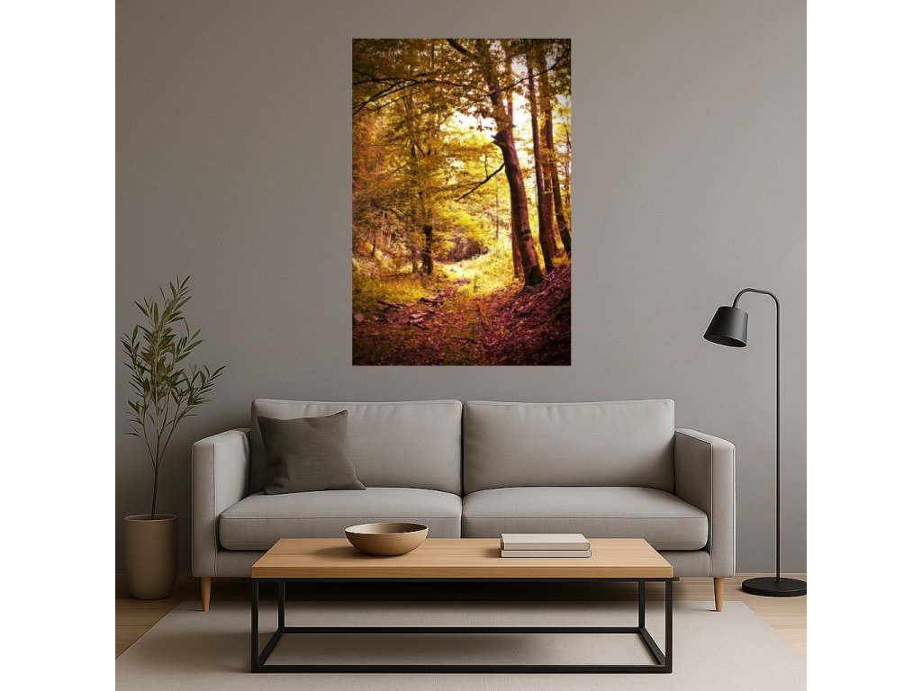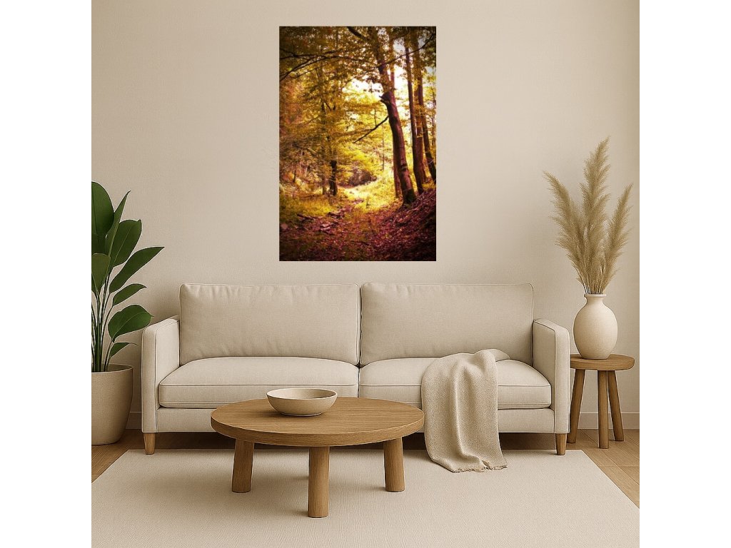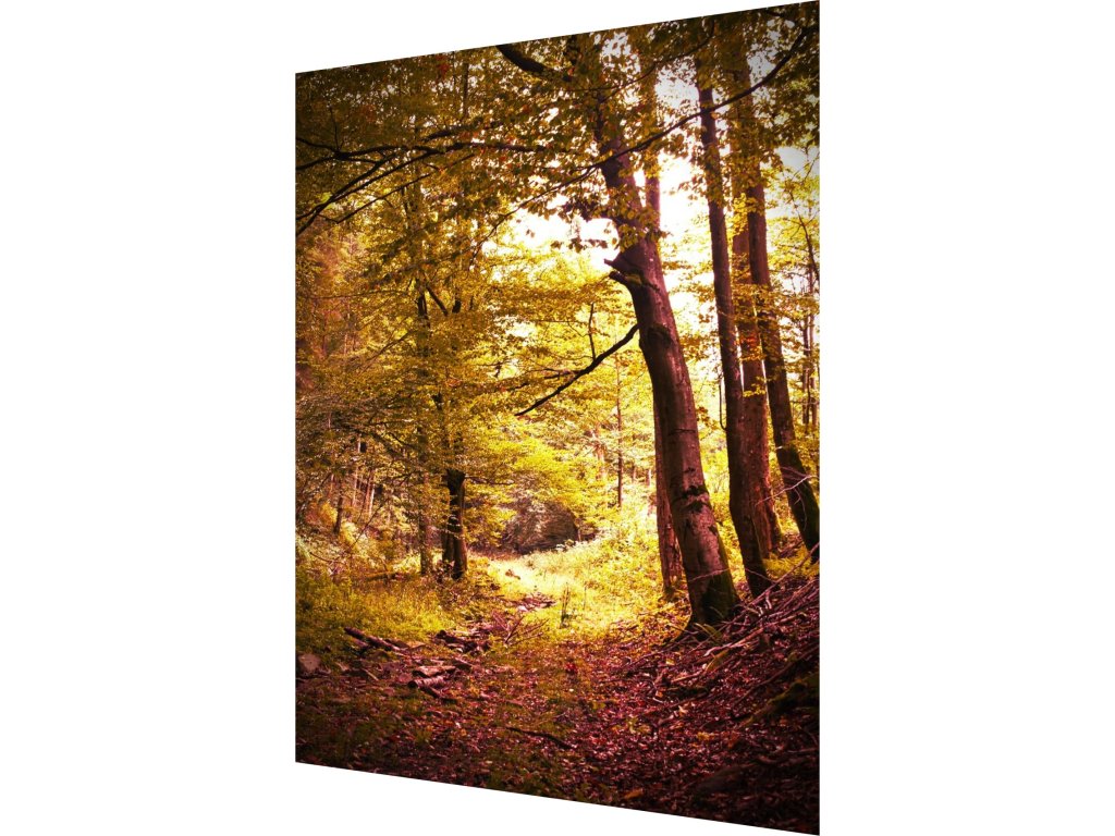 Fotoobraz s motivem podzimního lesa zalitého zlatavým světlem. Vnese do interiéru hřejivou atmosféru a klid.