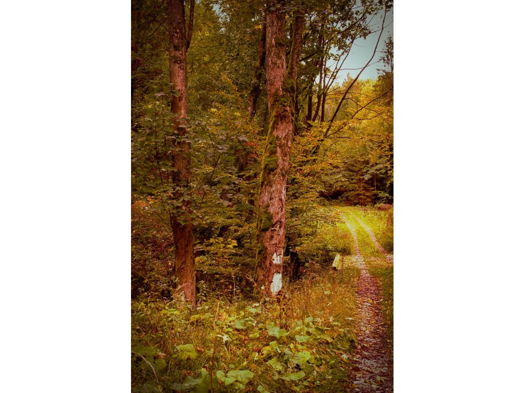 Tento fotoobraz zachycuje podzimní lesní cestu, která zve k tichému zastavení a odpočinku. Stromy se zbarvují do odstínů žluté, oranžové a hnědé, na kmeni je vidět turistická značka, která připomíná dobrodružství podzimních procházek.