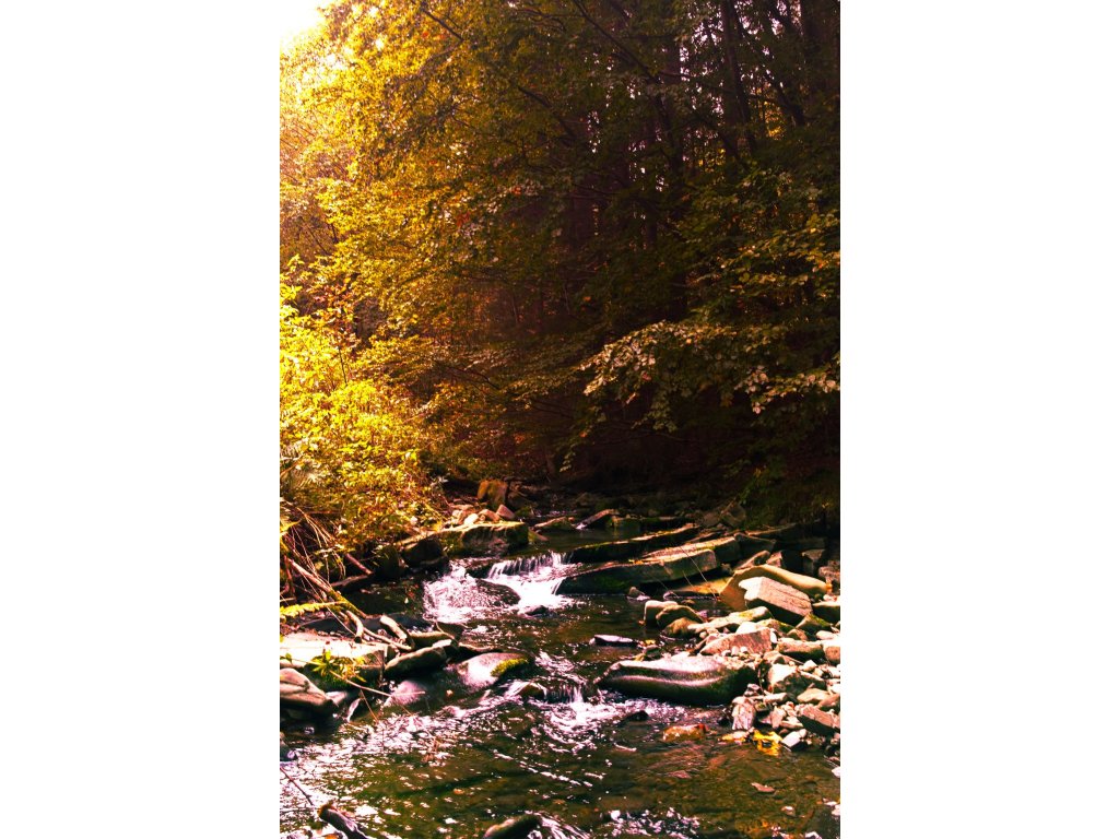 Tento fotoobraz zachycuje malý horský potok protékající mezi kameny v podzimním lese. Zlatavé listí a paprsky světla pronikající mezi stromy kontrastují s tmavšími tóny lesa a lesklou vodní hladinou. Výsledkem je harmonická kompozice plná pohybu a barev.