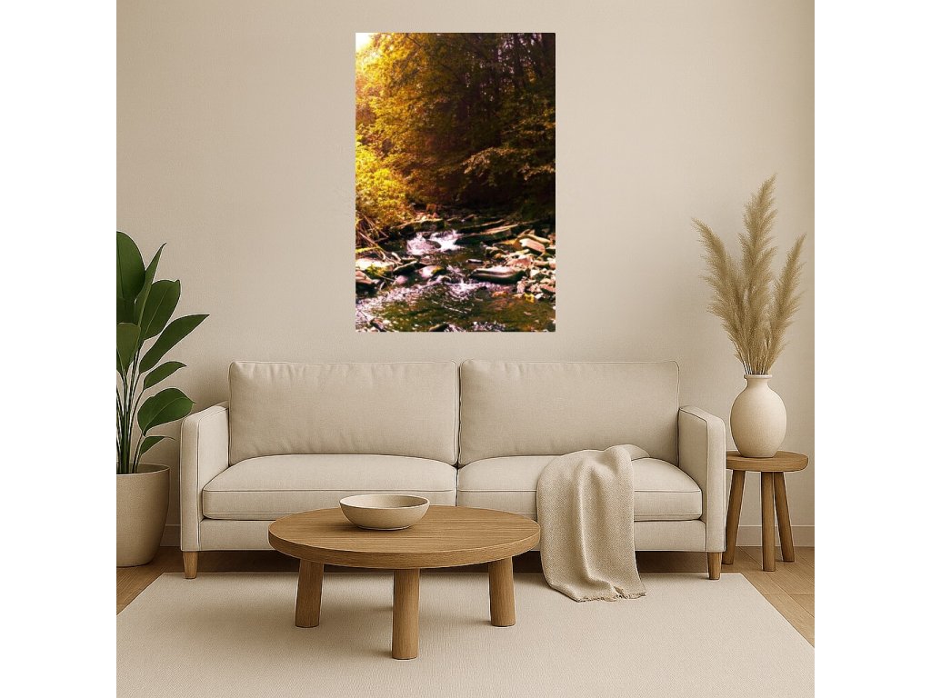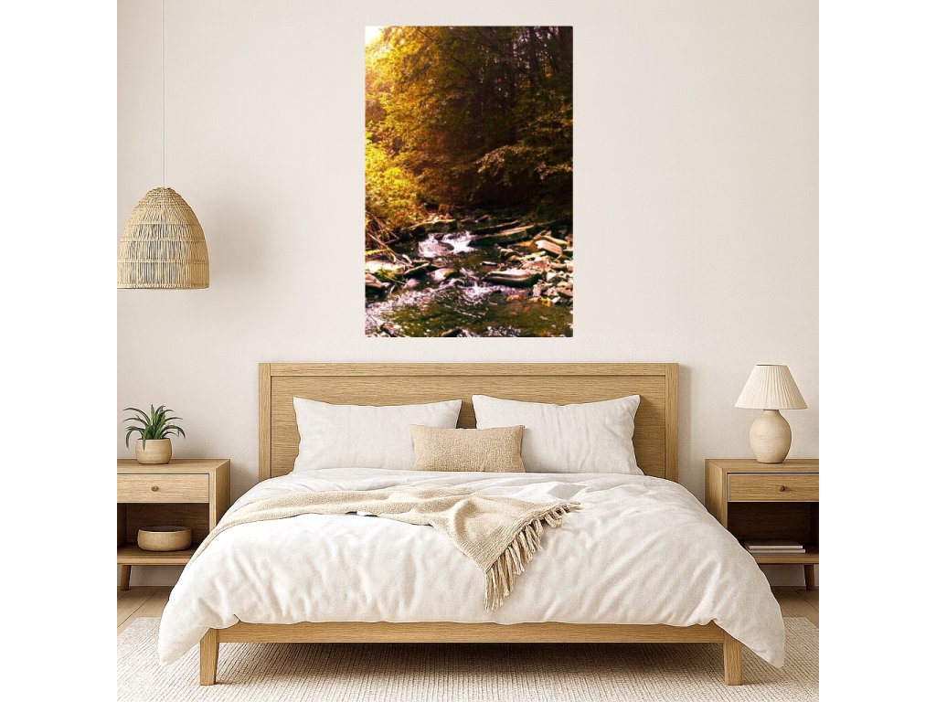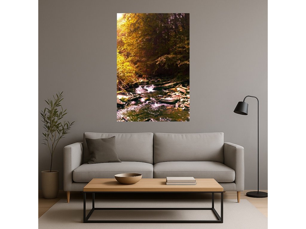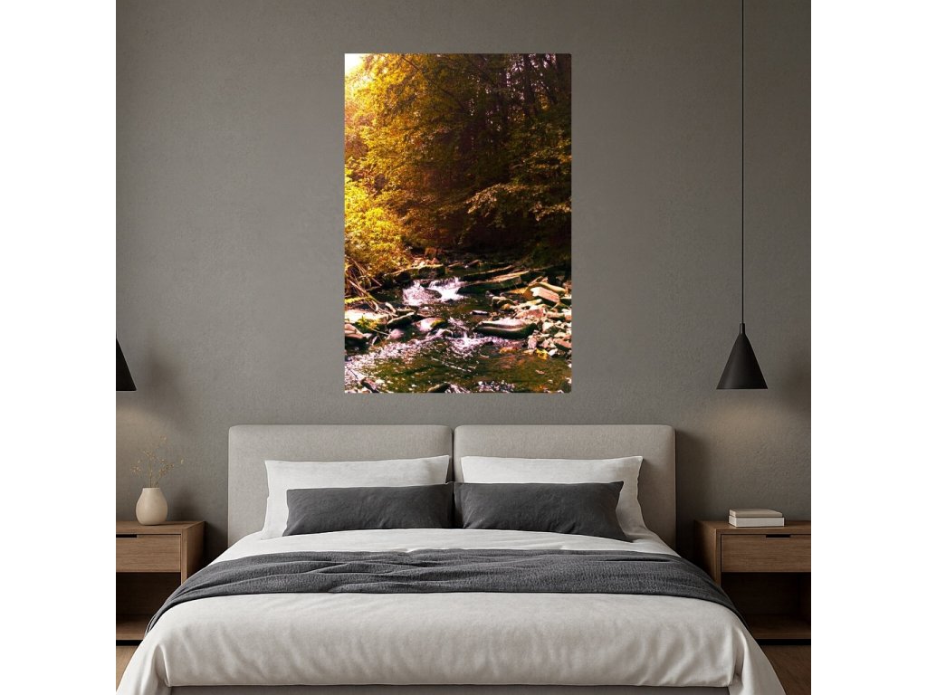 Obraz vnese do interiéru pocit svěžesti tekoucí vody i hřejivou atmosféru podzimní přírody. Hodí se do obývacího pokoje, pracovny či ložnice, kde vytvoří klidnou a přírodní náladu.
