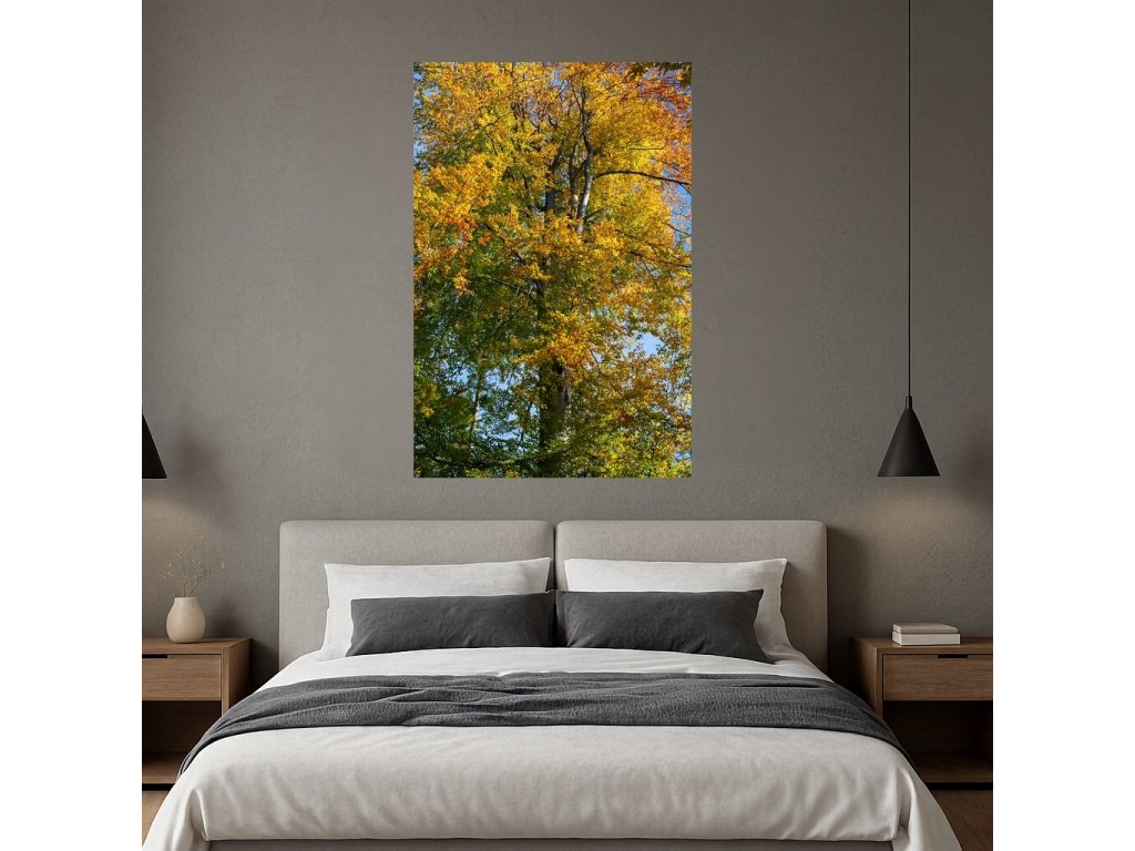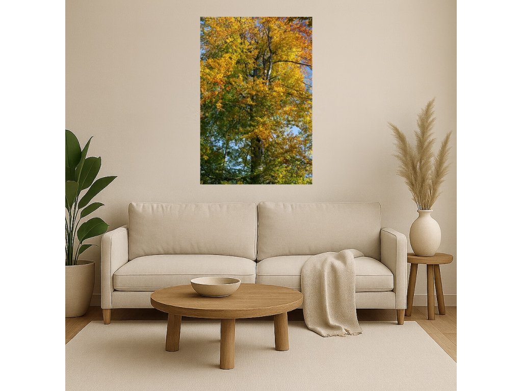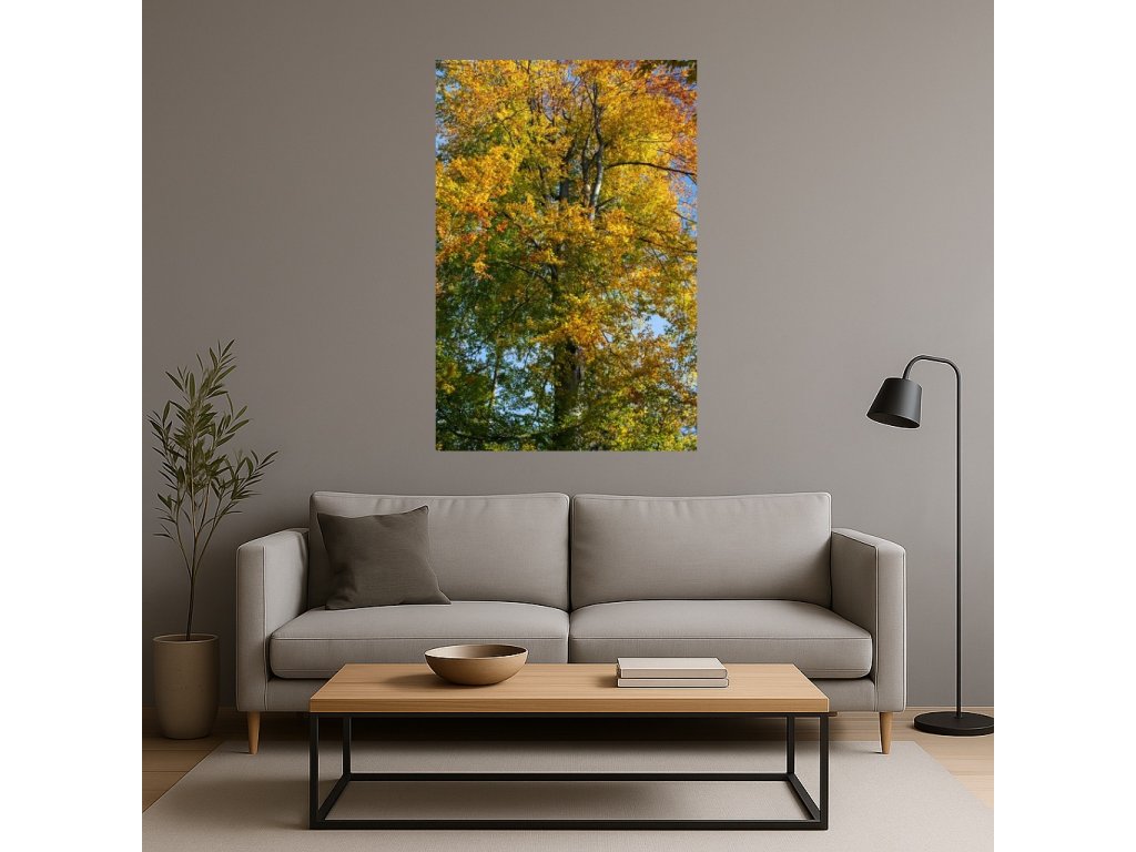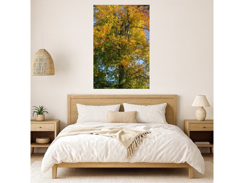 Tento fotoobraz zachycuje mohutný strom v plném podzimním zbarvení. Kombinace zlatých, oranžových a zelených listů kontrastuje s modrou oblohou a vytváří radostnou atmosféru, která vnese do prostoru energii i klid.