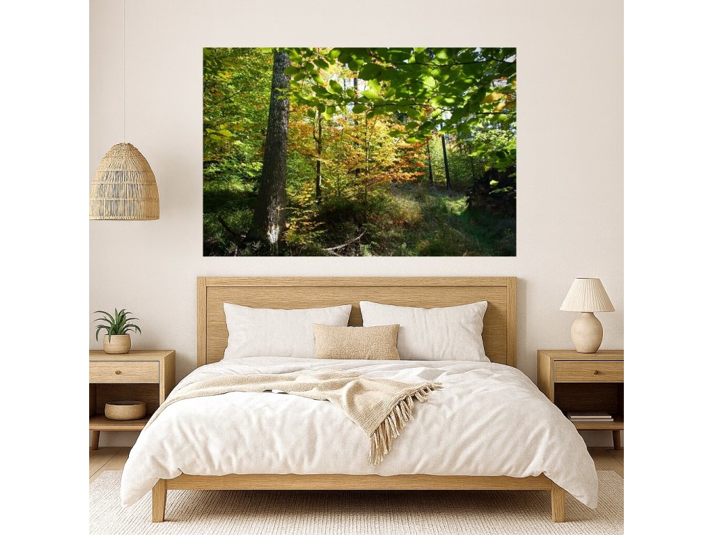 Fotoobraz s motivem lesa zalitého podzimním světlem. Kombinace zelených a zlatavých tónů vnese do interiéru harmonii a klid.