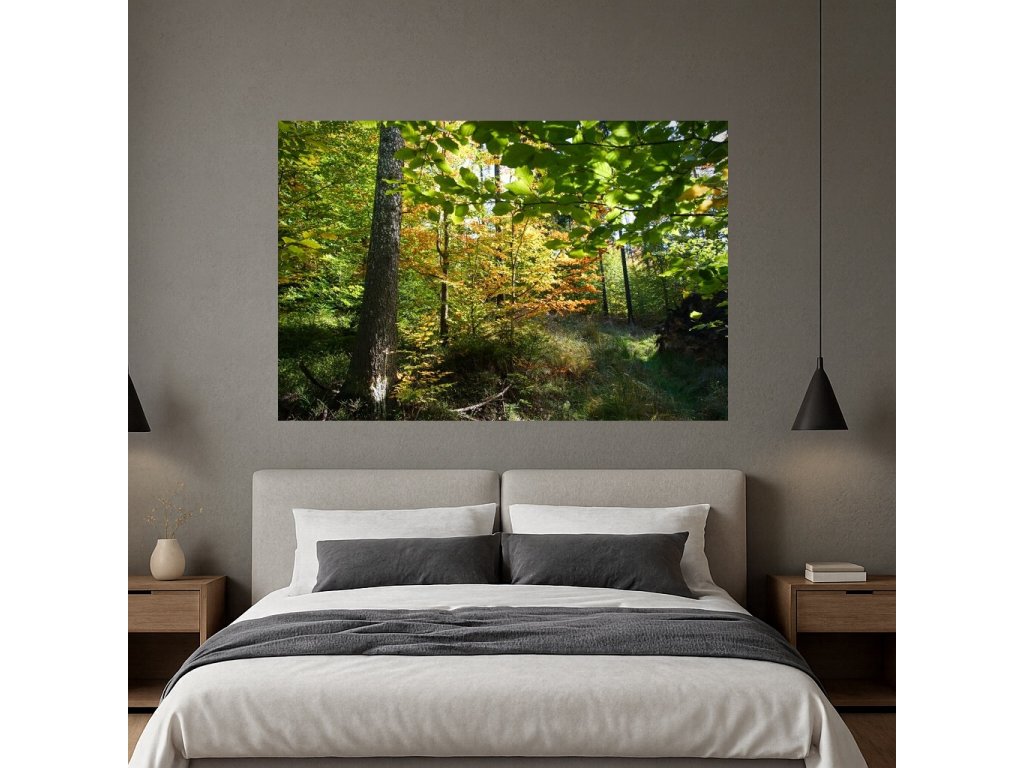 Fotoobraz s motivem lesa zalitého podzimním světlem. Kombinace zelených a zlatavých tónů vnese do interiéru harmonii a klid.