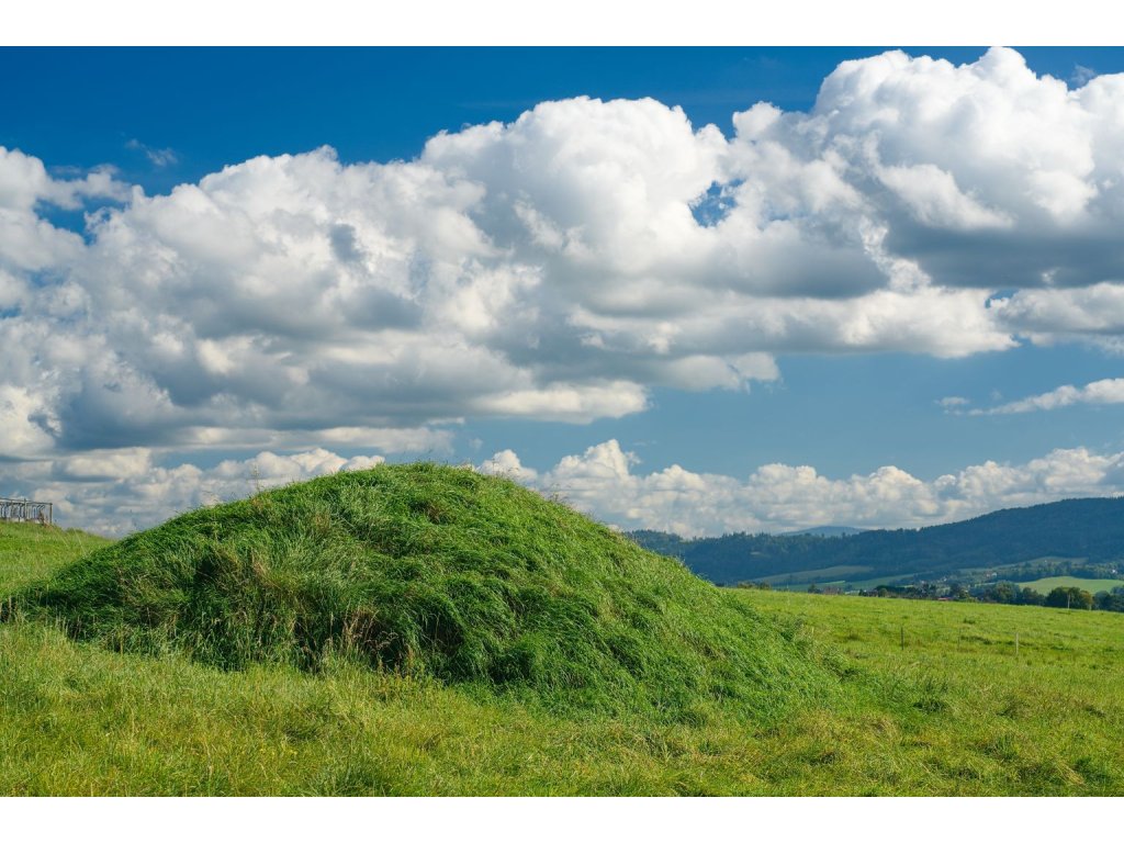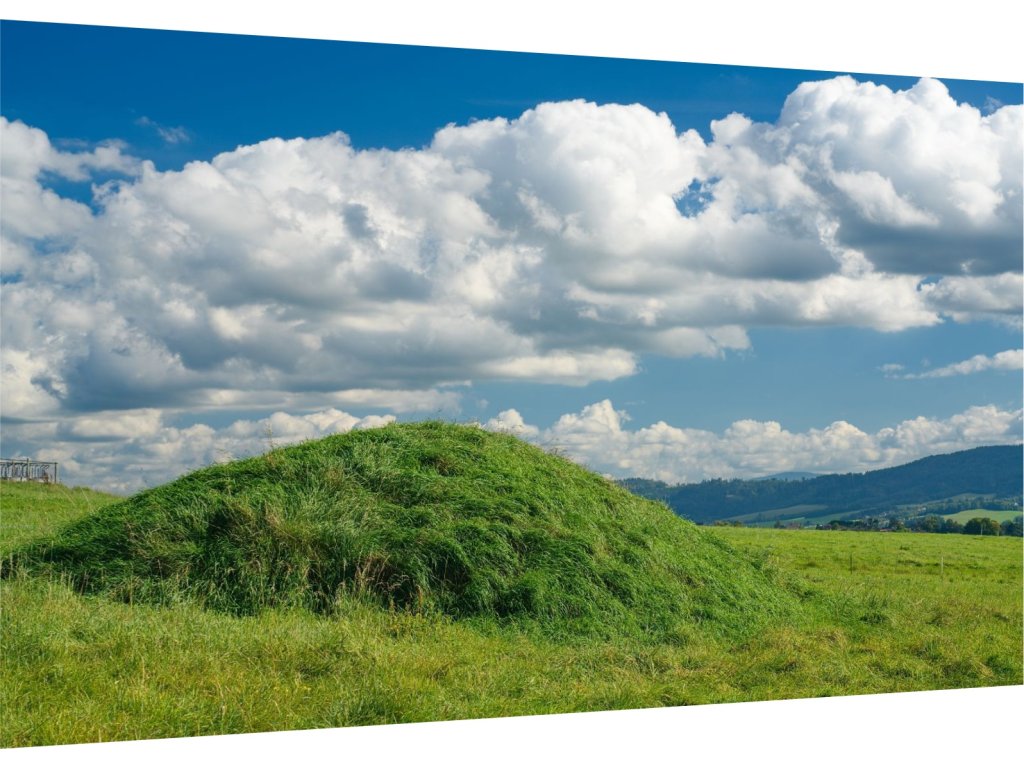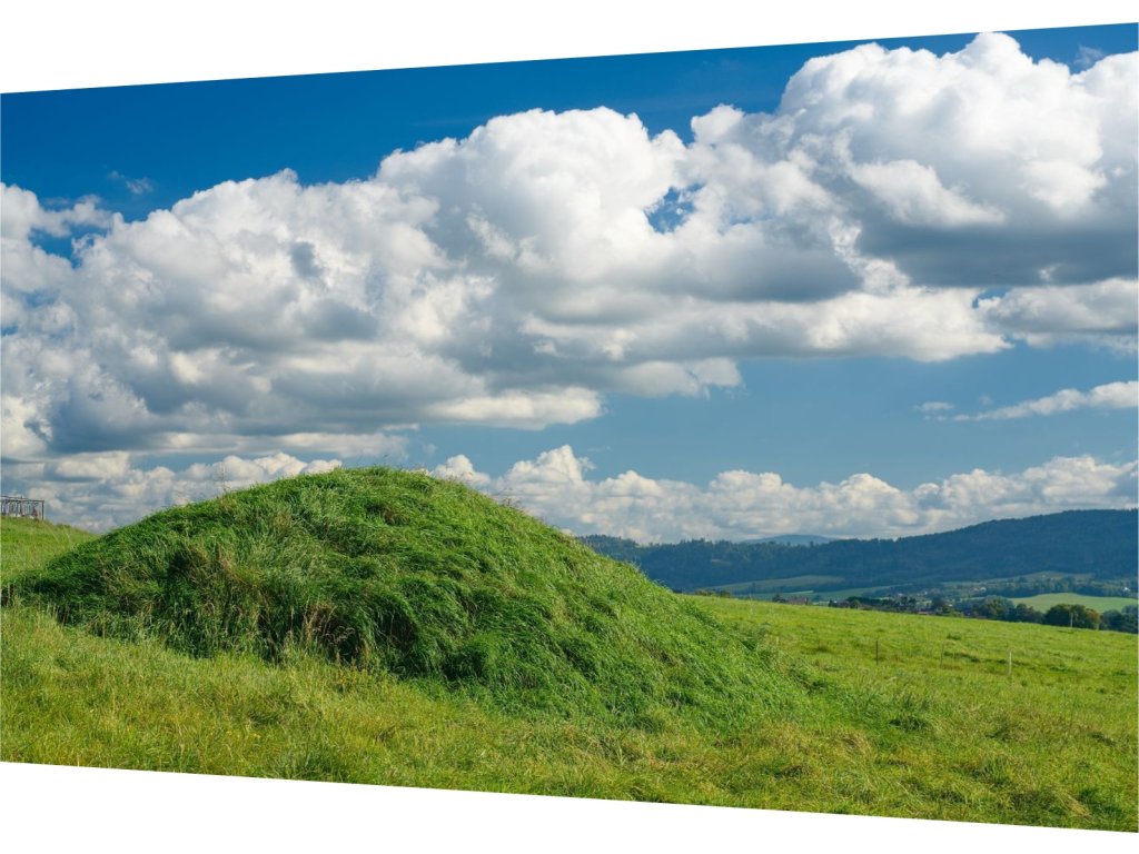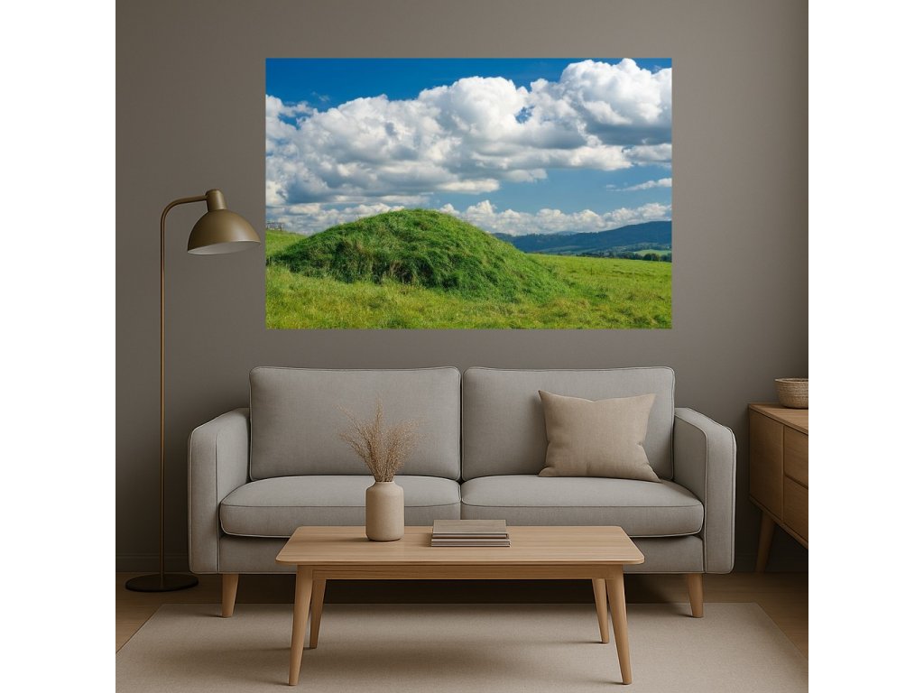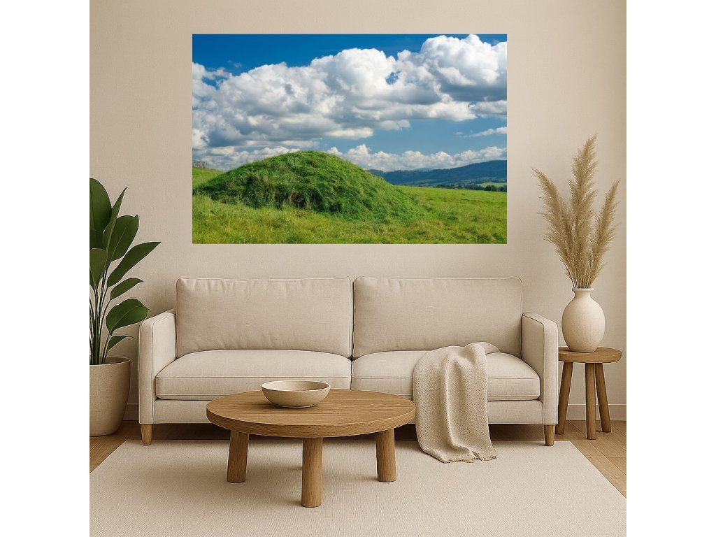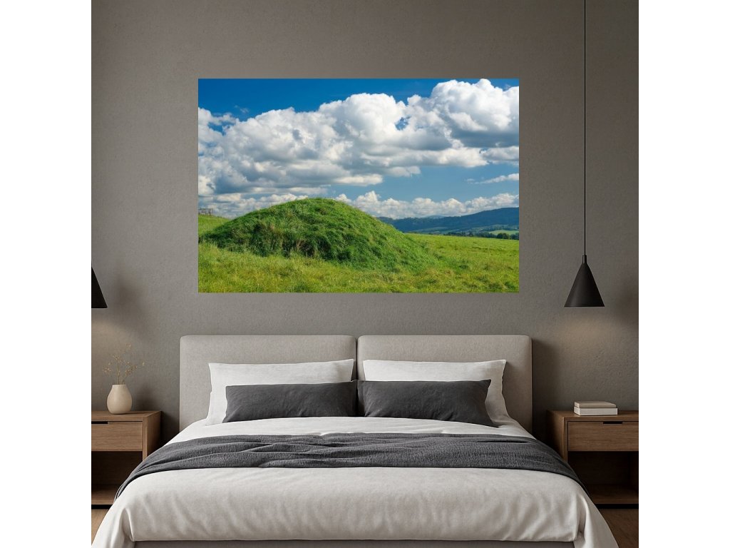 Tento fotoobraz zachycuje osamělý zelený pahorek uprostřed louky s výhledem na vzdálené kopce. Modrá obloha s dramatickými bílými oblaky dodává kompozici hloubku a dynamiku. Jednoduchost a výrazné barevné kontrasty působí uklidňujícím a zároveň originálním dojmem.