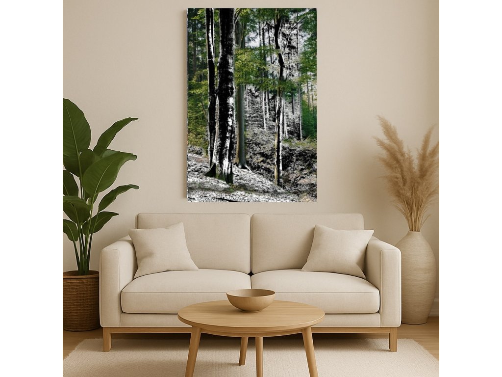 Fotoobraz „Barevná stínohra lesa“ přináší do interiéru výjimečný okamžik, kdy se sluneční světlo proměňuje v barevnou symfonii stínů mezi stromy. Tento obraz zachycuje křehkou rovnováhu mezi světlem a tmou, mezi tichem lesa a jeho živou energií. Je to vizuální poezie, která uklidní i inspiruje.