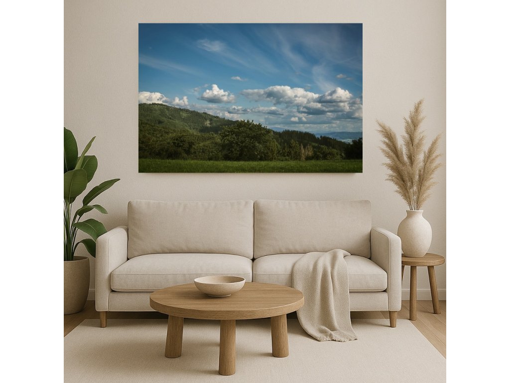 Fotoobraz „Bílé oblaka nad lesy“ nabízí silnou vizuální hru kontrastů – tmavé siluety stromů se noří do jasného nebe, po kterém plují bohaté bílé oblaky. Tento motiv přináší do interiéru svěžest, prostor a sílu přírodního živlu.