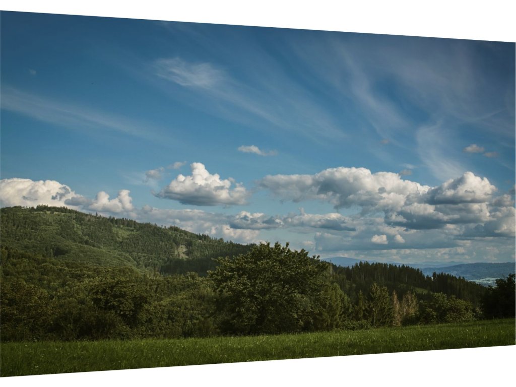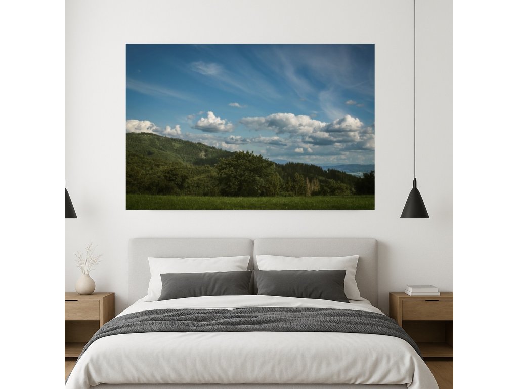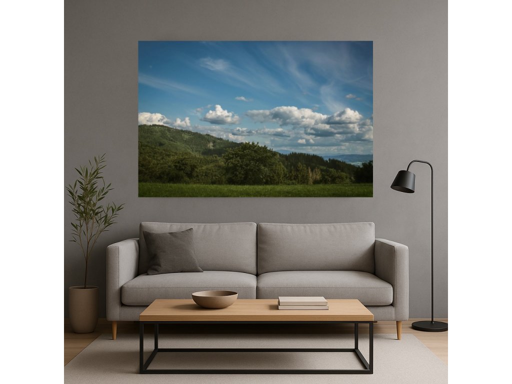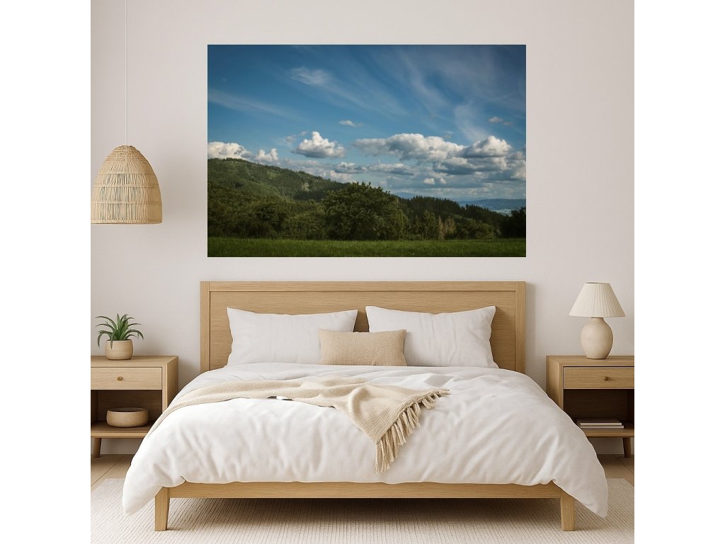 Fotoobraz „Bílé oblaka nad lesy“ nabízí silnou vizuální hru kontrastů – tmavé siluety stromů se noří do jasného nebe, po kterém plují bohaté bílé oblaky. Tento motiv přináší do interiéru svěžest, prostor a sílu přírodního živlu.