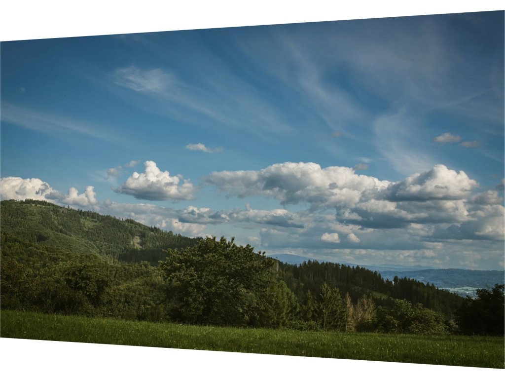 Fotoobraz „Bílé oblaka nad lesy“ zachycuje kontrast mezi tmavým lesem a zářivou oblohou plnou bílých oblak. K dispozici jako tisk na plátně nebo akrylátovém skle. Nejsme plátci DPH.