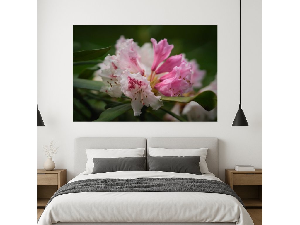 Detailní pohled na rozkvetlý rododendron v jemných tónech růžové a bílé. Tento obraz zachycuje křehkost a tichou sílu přírody v okamžiku její největší krásy. Světlo, které se odráží na květech, tvoří harmonii klidu, čistoty a něhy. Fotoobraz je vyráběn na zakázku. Odesíláme do 4 pracovních dnů, doručení trvá obvykle 1–3 dny.