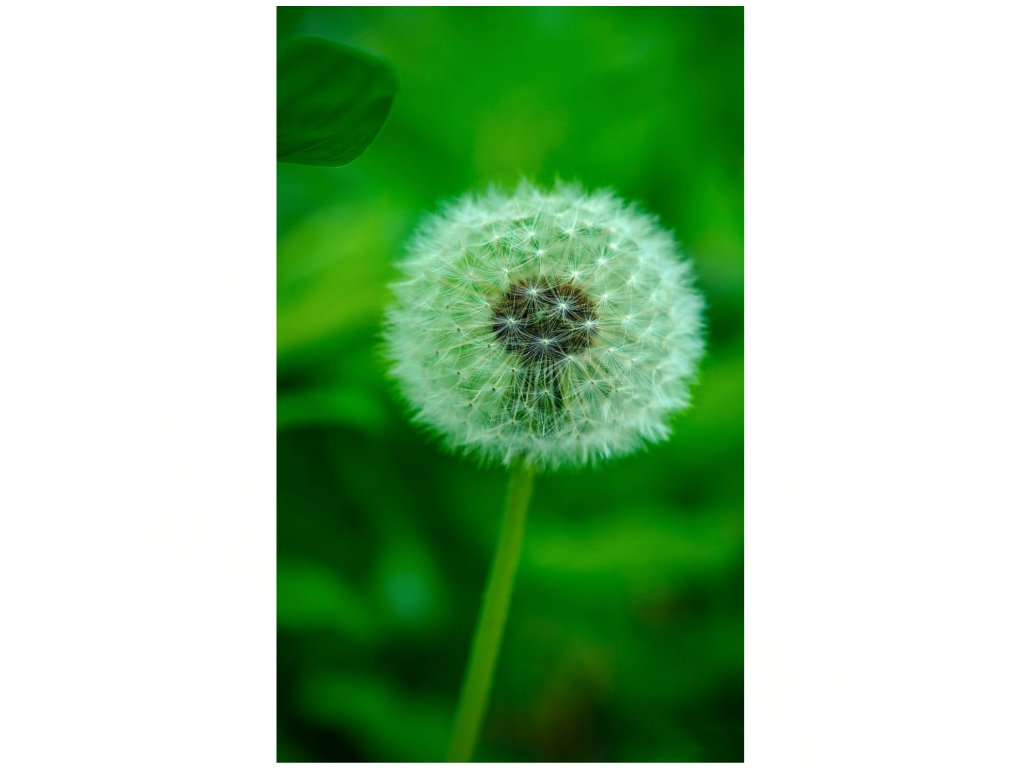Minimalistický detail bílé pampelišky v kontrastu se zeleným pozadím a rozostřeným zeleným listem. Fotoobraz je k dispozici na plátně nebo akrylátovém skle v několika rozměrech. Nejsme plátci DPH.