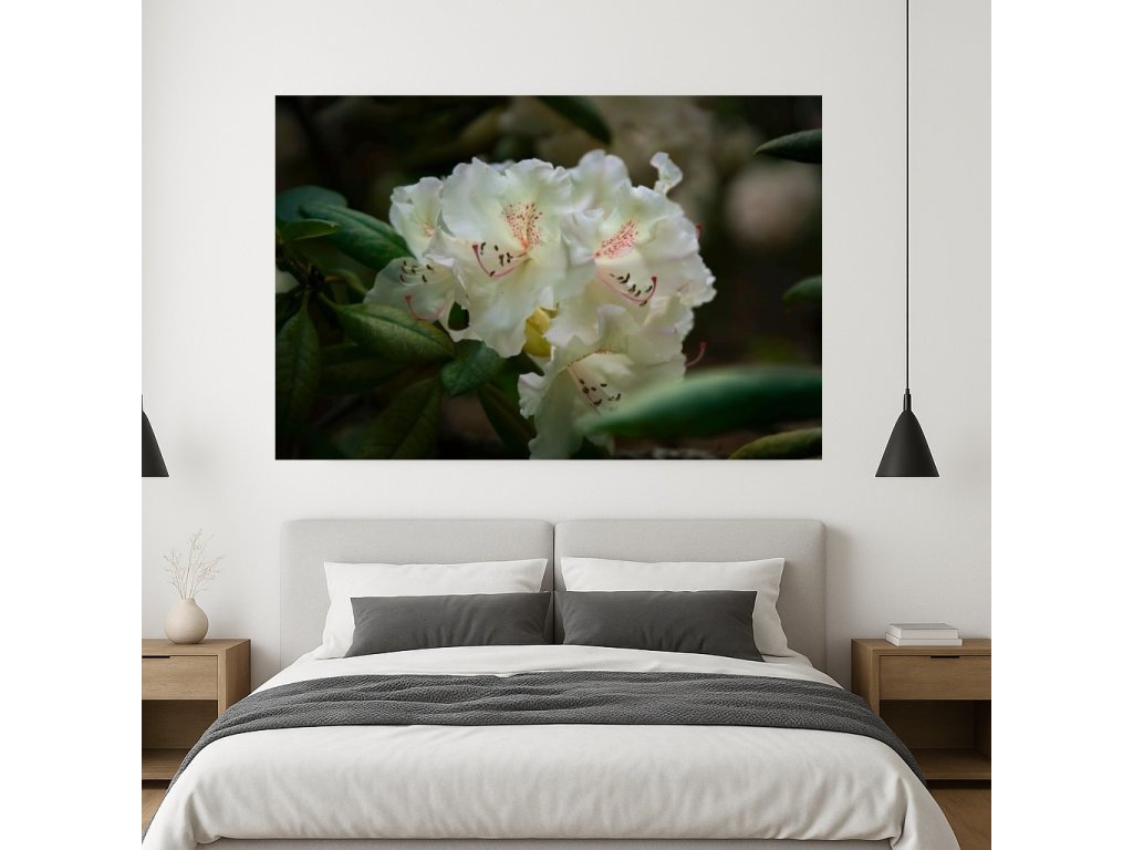 Detailní fotoobraz bílého rododendronu s ostrou kresbou květu a méně ostrými tmavě zelenými listy na velmi tmavém rozostřeném pozadí. Fotoobraz je k dispozici na plátně nebo akrylátovém skle v několika rozměrech. Nejsme plátci DPH.