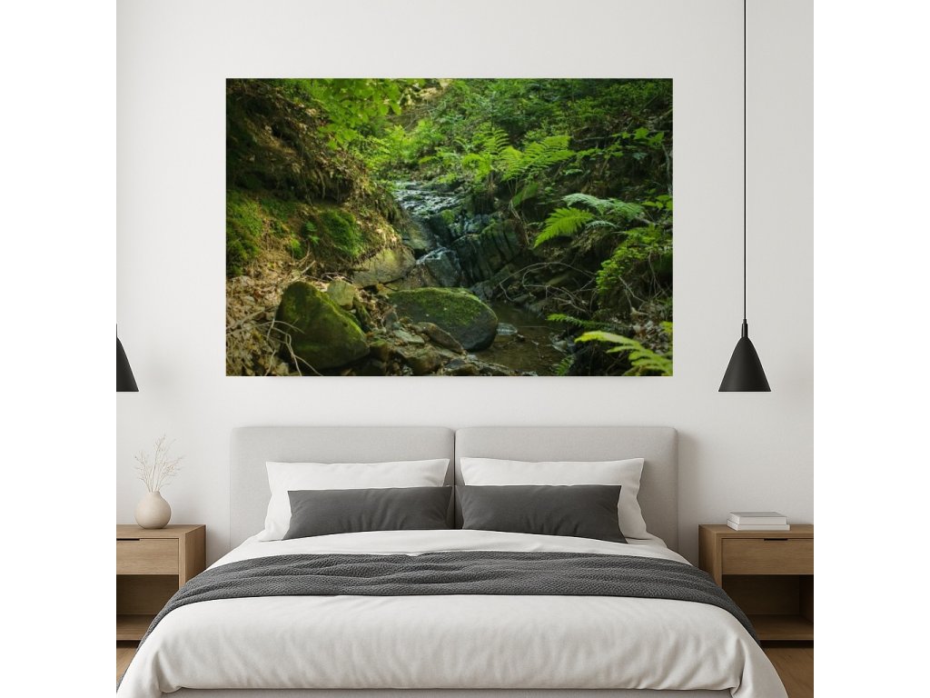 Tento fotoobraz zachycuje klidný horský potok, jehož proud tiše protéká mezi svěží zelení kapradí. Hnědozelené kameny v potoce vytvářejí kontrast s jemnou vegetaci kolem. Celý obraz přináší pocit pohody a klidu, který je typický pro horské bystřiny, ideální pro milovníky přírody a těch, kteří touží po klidném, přírodním zážitku v interiéru. Fotoobraz je vyráběn na zakázku. Odesíláme do 4 pracovních dnů, doručení trvá obvykle 1–3 dny.