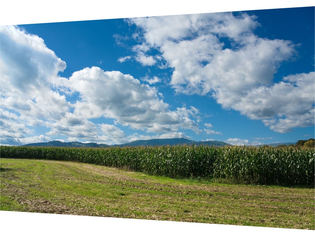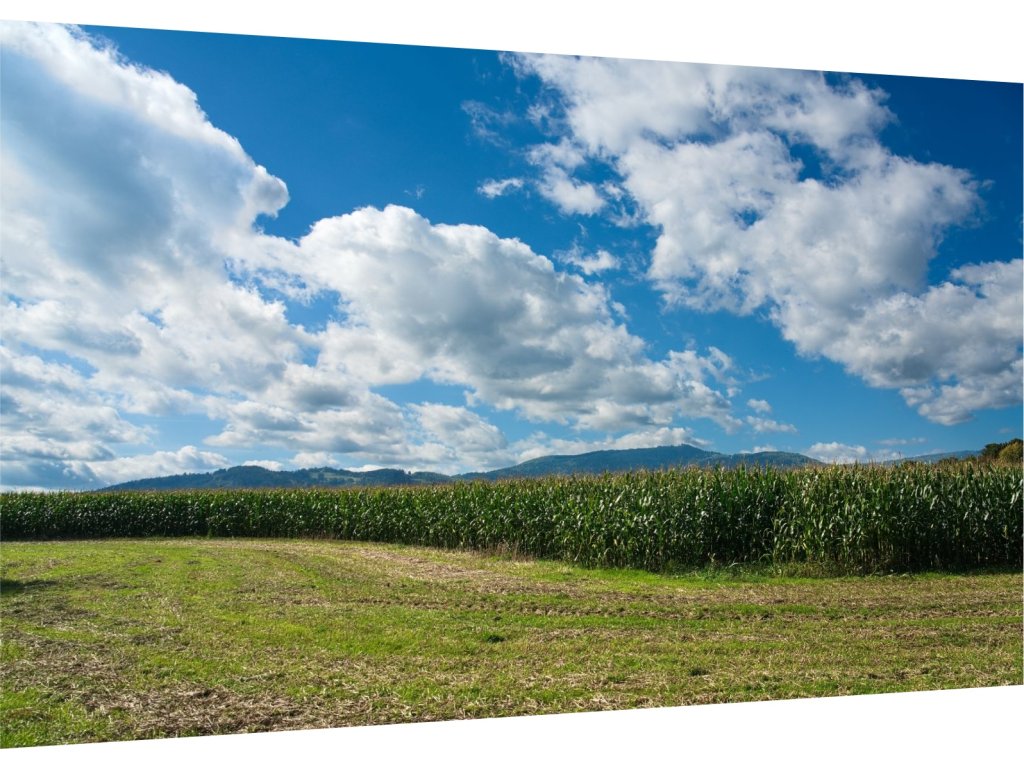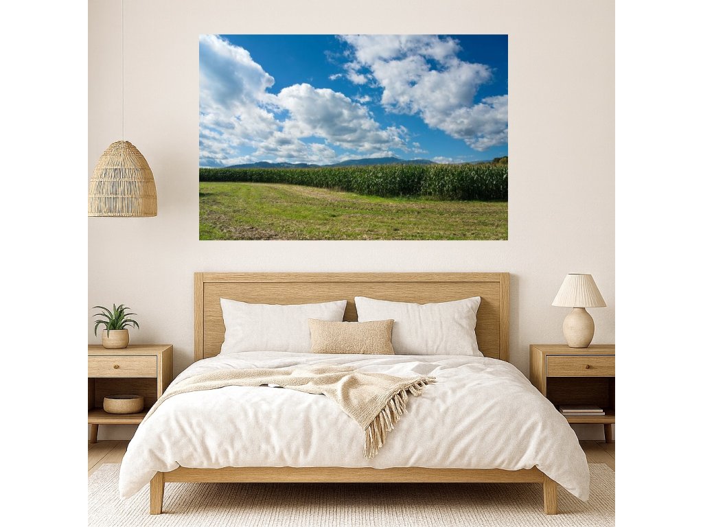 Tento fotoobraz zachycuje pohled na zelené pole v letním slunci, v pozadí s jemnou linií hor a dramatickou oblohou plnou bílých oblaků. Přirozené barvy a široký horizont působí uklidňujícím dojmem a dodají vašemu interiéru pocit volnosti.