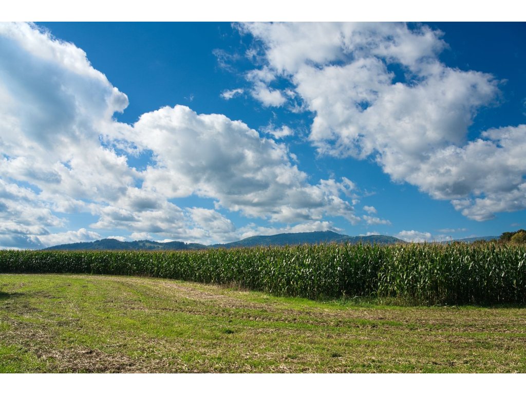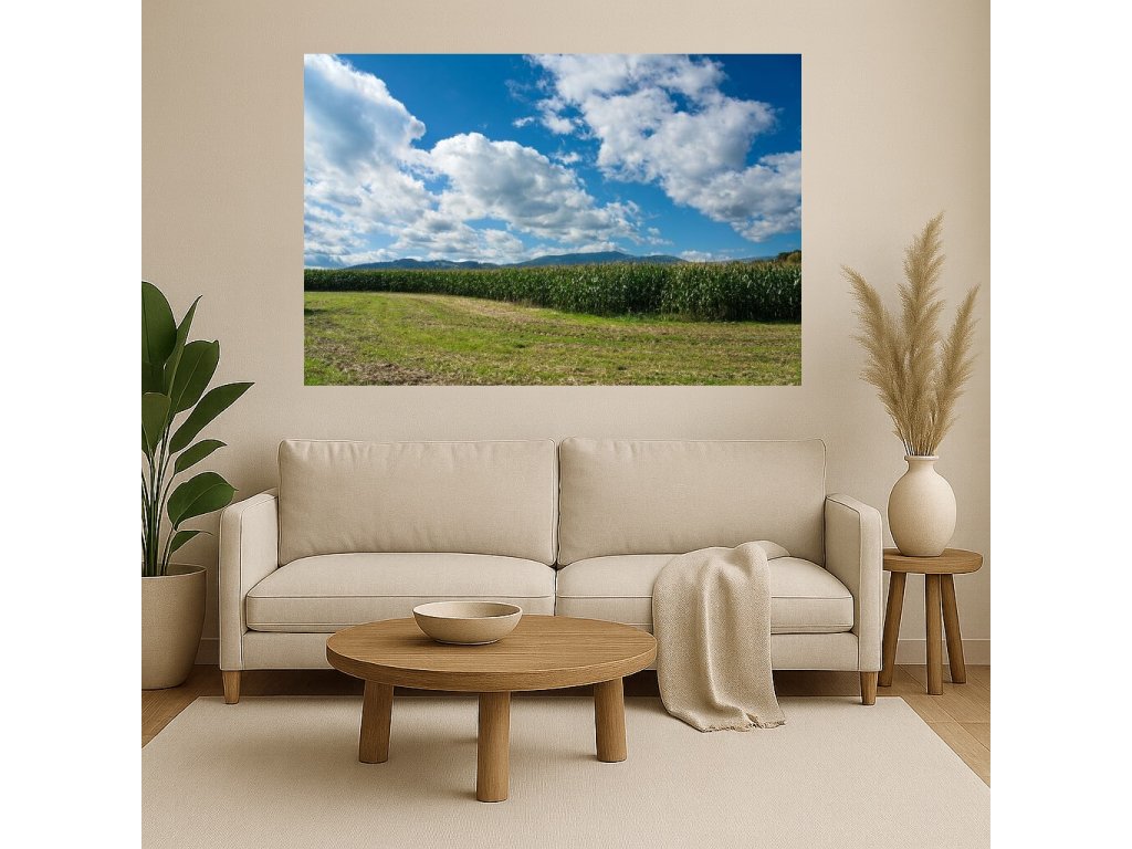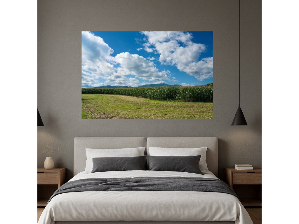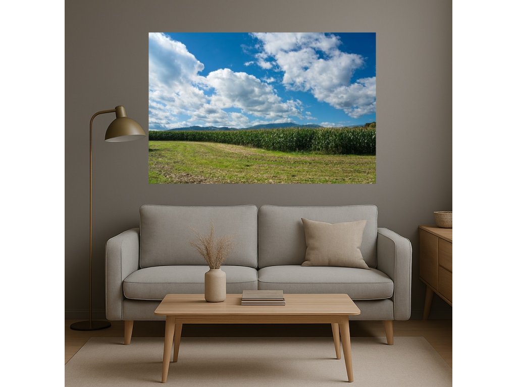 Tento fotoobraz zachycuje pohled na zelené pole v letním slunci, v pozadí s jemnou linií hor a dramatickou oblohou plnou bílých oblaků. Přirozené barvy a široký horizont působí uklidňujícím dojmem a dodají vašemu interiéru pocit volnosti.