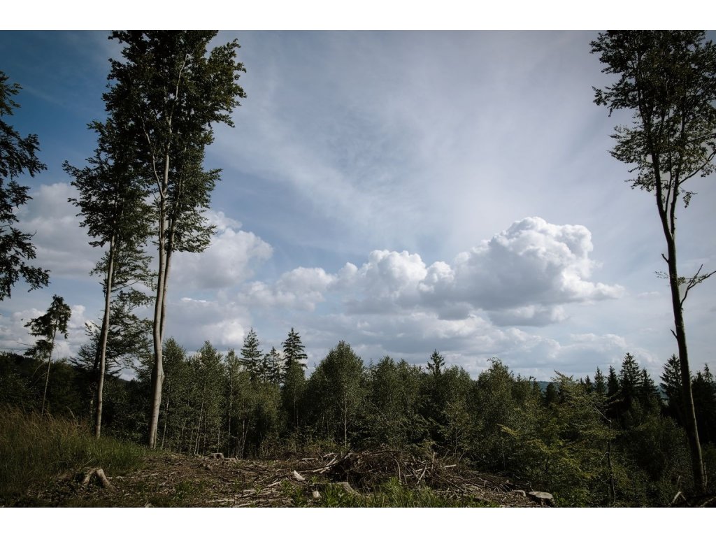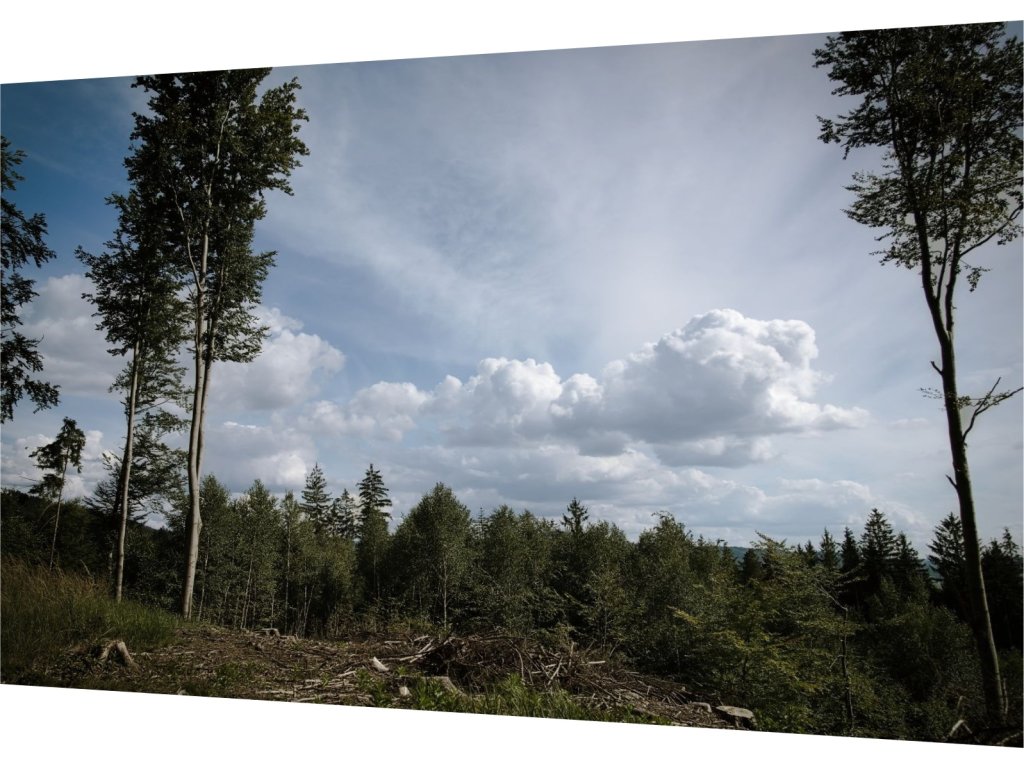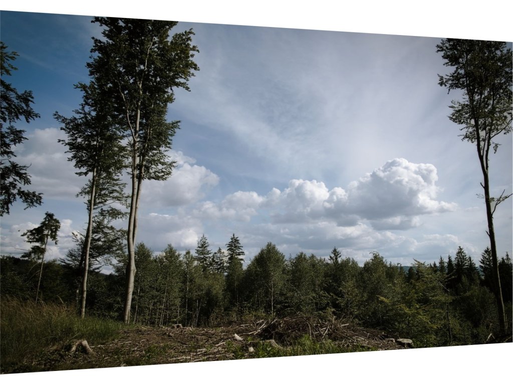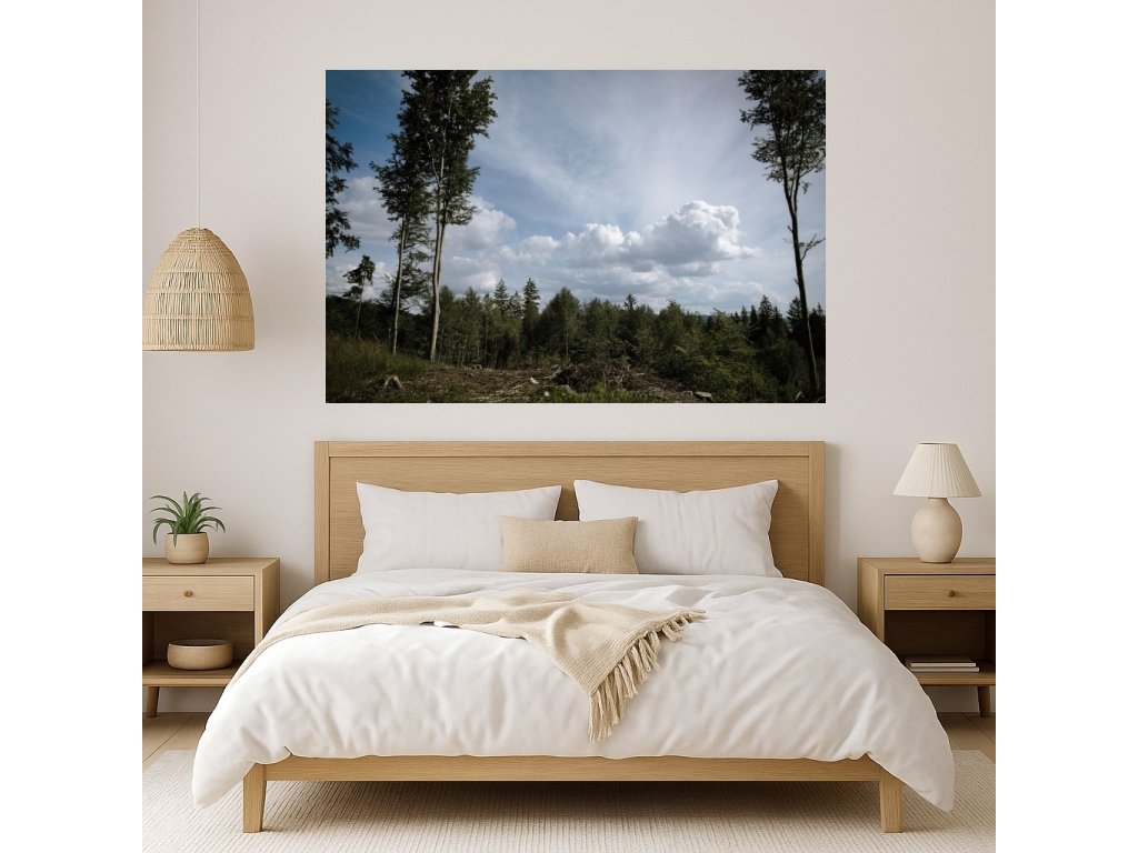 Fotoobraz „Na okraji lesa“ zachycuje setkání lesa a oblohy s výraznými bílými oblaky. K dispozici jako tisk na plátně nebo akrylátovém skle. Nejsme plátci DPH.