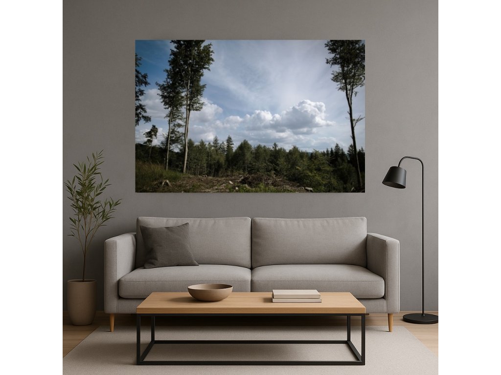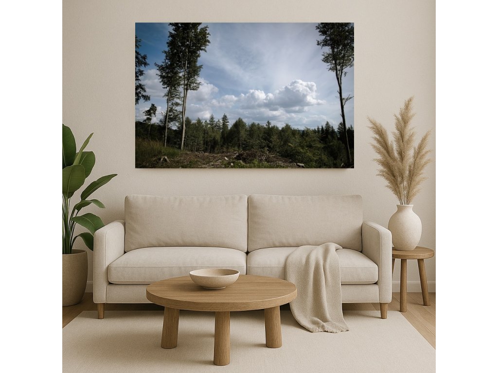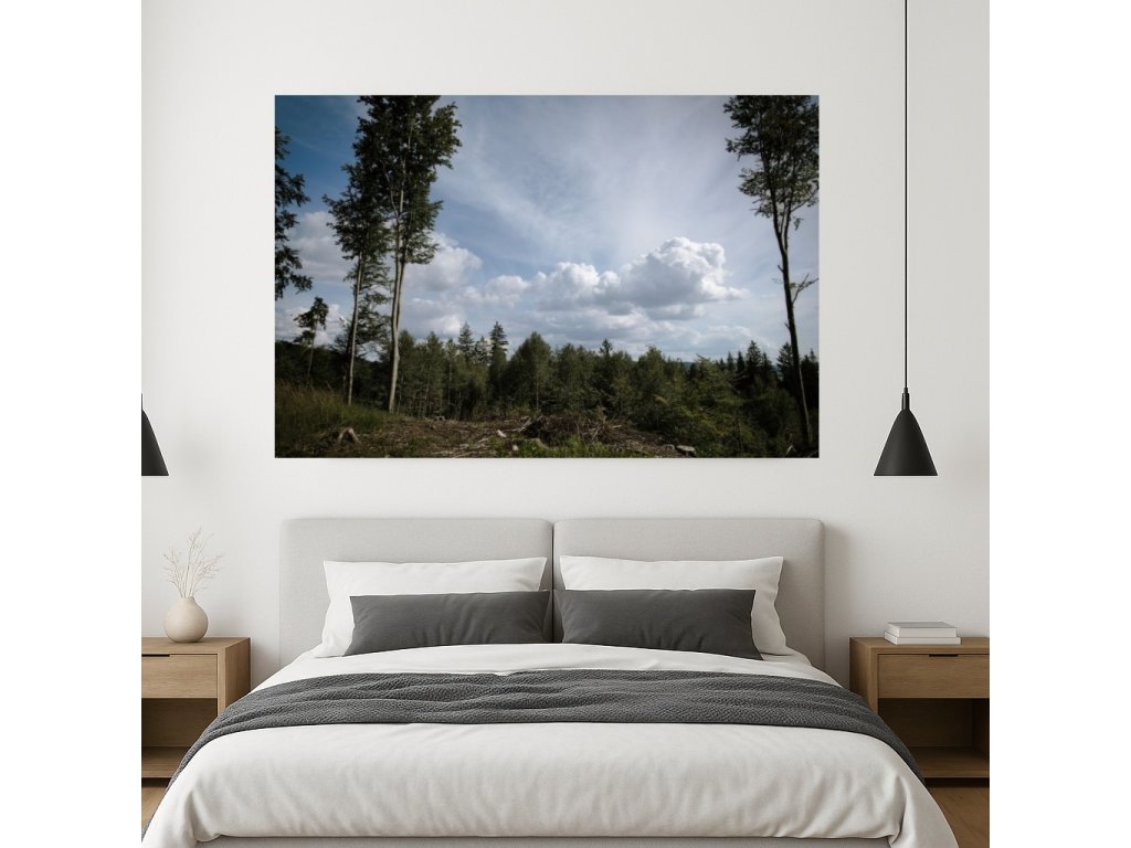 Fotoobraz „Na okraji lesa“ zachycuje setkání lesa a oblohy s výraznými bílými oblaky. K dispozici jako tisk na plátně nebo akrylátovém skle. Nejsme plátci DPH.