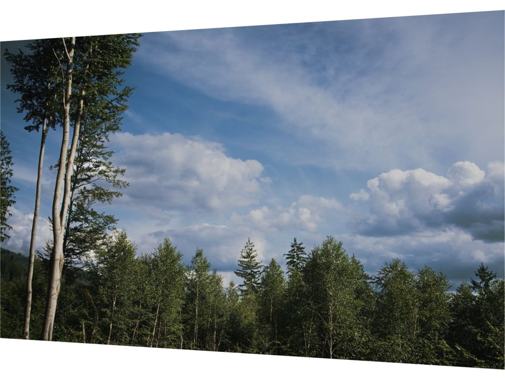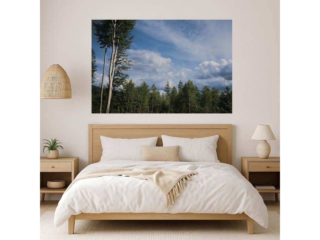 Fotoobraz „Nebe nad stromy“ přináší nevšední pohled vzhůru – k nebi, které se rozprostírá nad korunami vzrostlých stromů. Spojení silné přírodní energie a volnosti prostoru působí uklidňujícím dojmem a dodává interiéru vzdušnost i hloubku.