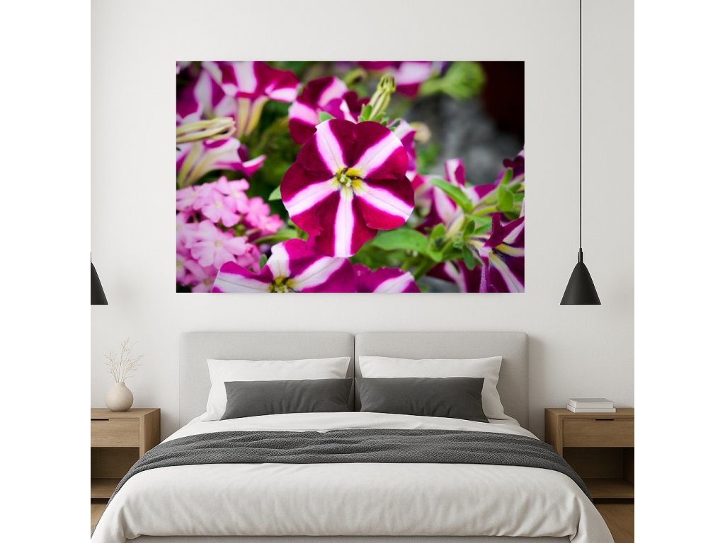 Detail květu petunie s výrazným červenofialovým zbarvením a bílou pěticípou hvězdou uprostřed. Zachycený v ranním světle září jako něžný vesmírný úkaz v zahradním světě. Tento obraz spojuje sílu barvy s dokonalostí tvaru a přináší do interiéru harmonii a optimismus. Fotoobraz je vyráběn na zakázku. Odesíláme do 4 pracovních dnů, doručení trvá obvykle 1–3 dny.