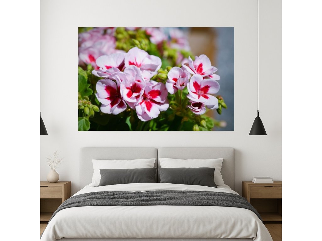 Nádherné květy jarních Pelargonií rozjasněné ranním sluncem. Fotoobraz je k dispozici na plátně nebo akrylátovém skle v několika rozměrech. Nejsme plátci DPH.