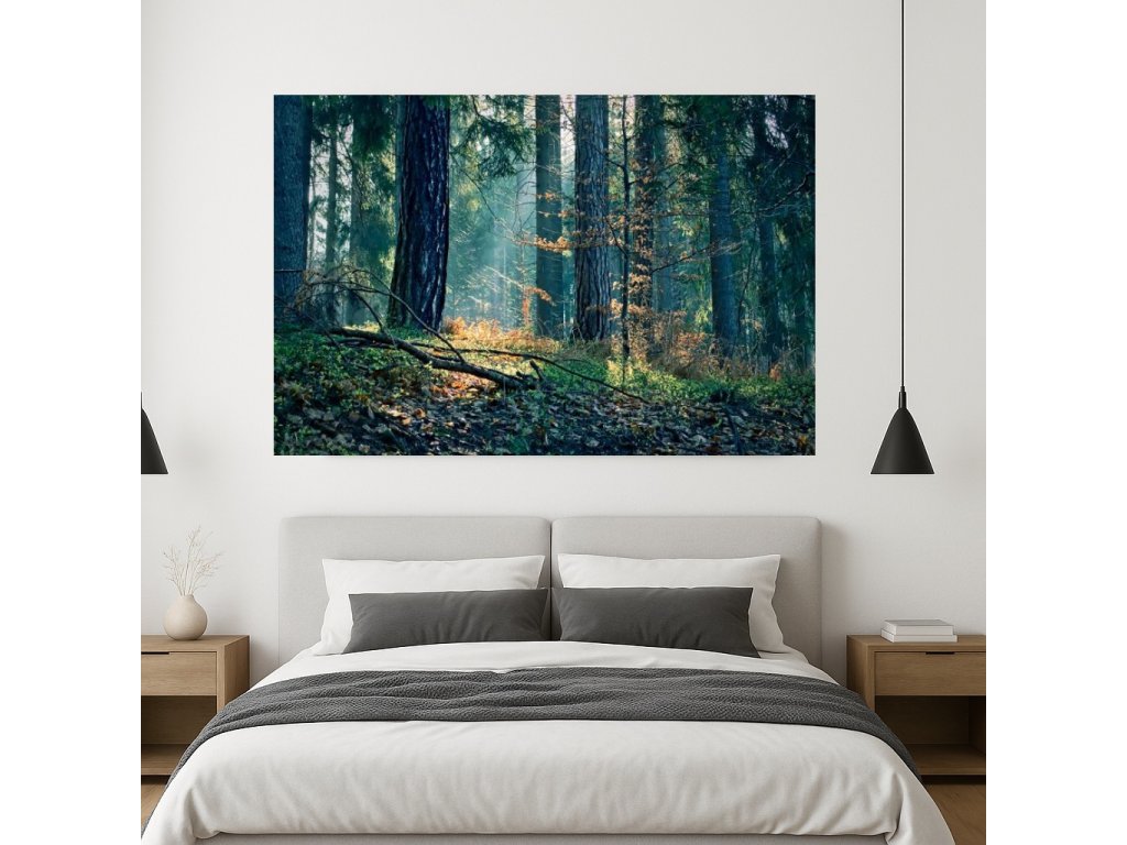 Detailní fotoobraz zachycující stromy v lese, mezi kterými prosvítá slunce, které se dere přes mlhavý opar při východu slunce. Fotoobraz je k dispozici na plátně nebo akrylátovém skle v několika rozměrech. Nejsme plátci DPH.