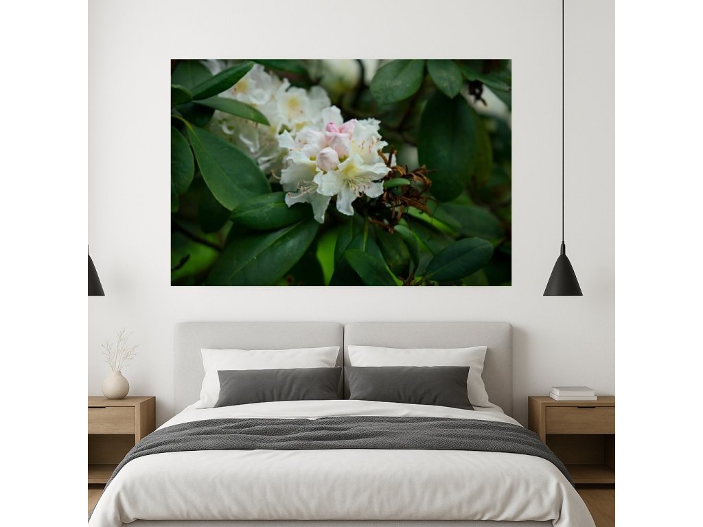 Detail bílého rododendronu zachycený v ranním světle. Květ působí jako jemná svatební závojová látka — čistý, křehký a zářící klidem. Tento obraz přináší do prostoru pocit nového začátku a neokázalé elegance. Fotoobraz je vyráběn na zakázku. Odesíláme do 4 pracovních dnů, doručení trvá obvykle 1–3 dny.