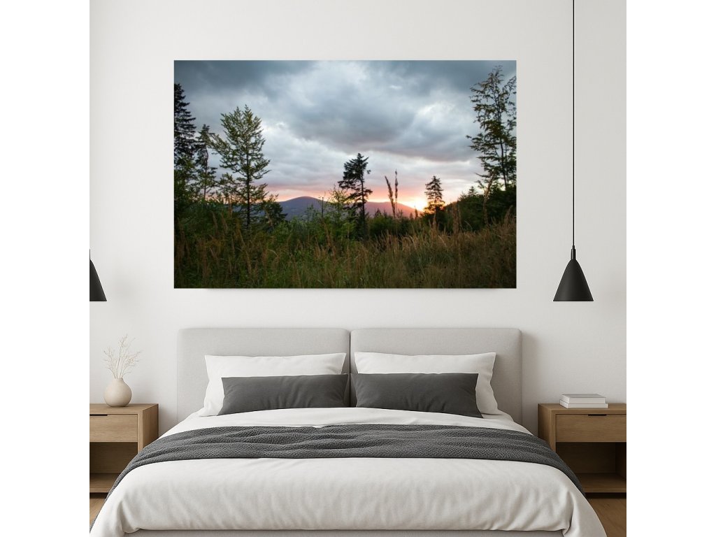 Podvečerní krajina beskydského lesa s pohledem na západ slunce a dramatickými šedými mraky nad vrcholy Beskyd. Fotoobraz je k dispozici na plátně nebo akrylátovém skle v několika rozměrech. Nejsme plátci DPH.