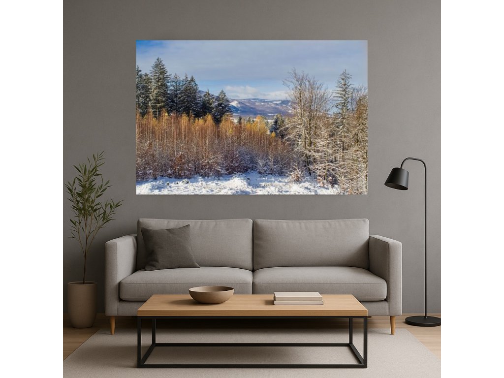 Nádherná zimní krajina Slezských Beskyd, kde bílý sníh kontrastuje se zlatými lístky březového lesíku, celý fotoobraz je zalitý sluncem. Fotoobraz je k dispozici na plátně nebo akrylátovém skle v několika rozměrech. Nejsme plátci DPH.