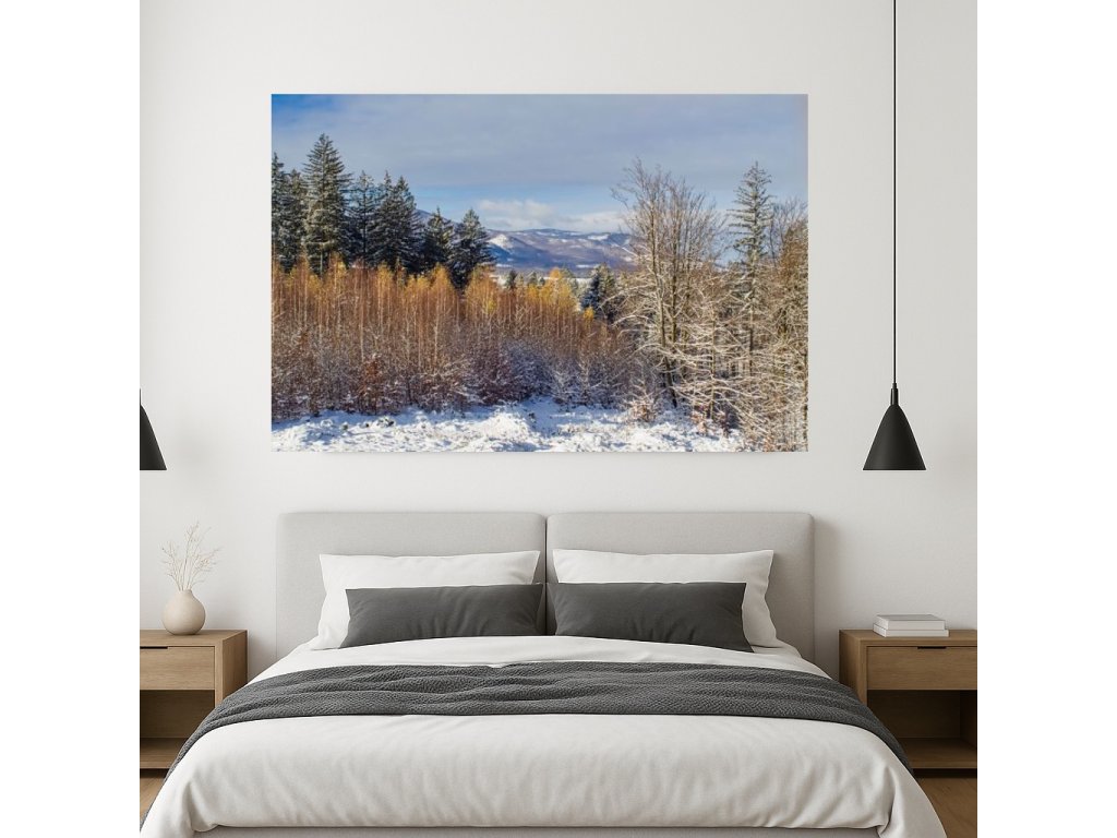 Nádherná zimní krajina Slezských Beskyd, kde bílý sníh kontrastuje se zlatými lístky březového lesíku, celý fotoobraz je zalitý sluncem. Fotoobraz je k dispozici na plátně nebo akrylátovém skle v několika rozměrech. Nejsme plátci DPH.